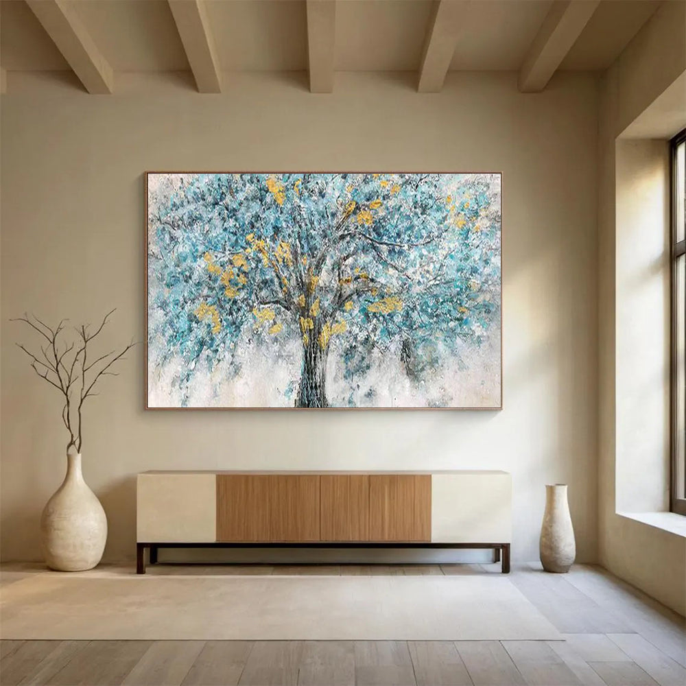 Blue Tree “Golden Accents” Painting on Canvas, Whimsical Landscape Art DKH889