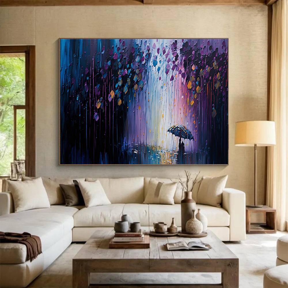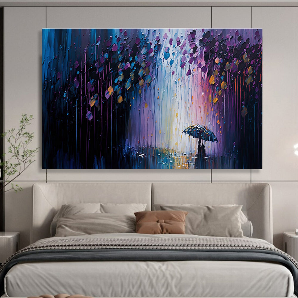 Inspired by rainy evening strolls, the artist used vibrant colors to paint a rainy scene, mixing purples and blues for a dreamy feel. They added a couple under an umbrella, creating romance. Perfect for a date night spot, adding intimacy, or a bedroom, enhancing cozy vibes. The artist hoped to share the magic of rainy nights, letting viewers feel the love in the downpour. This work is a walk in the rain, a romantic journey through color.