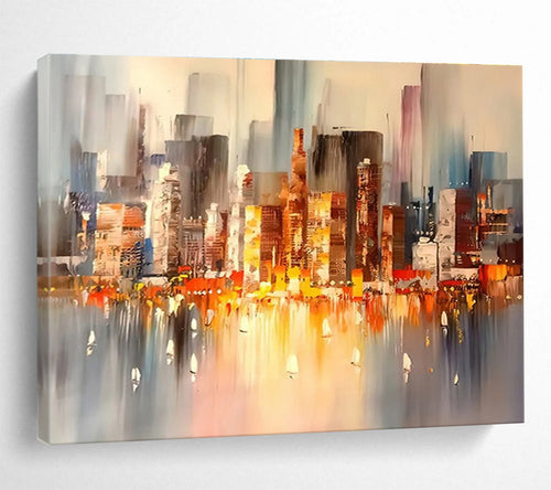 City Sunset “Luminous Skyline” Painting on Canvas, Dynamic Cityscape Art DKH899