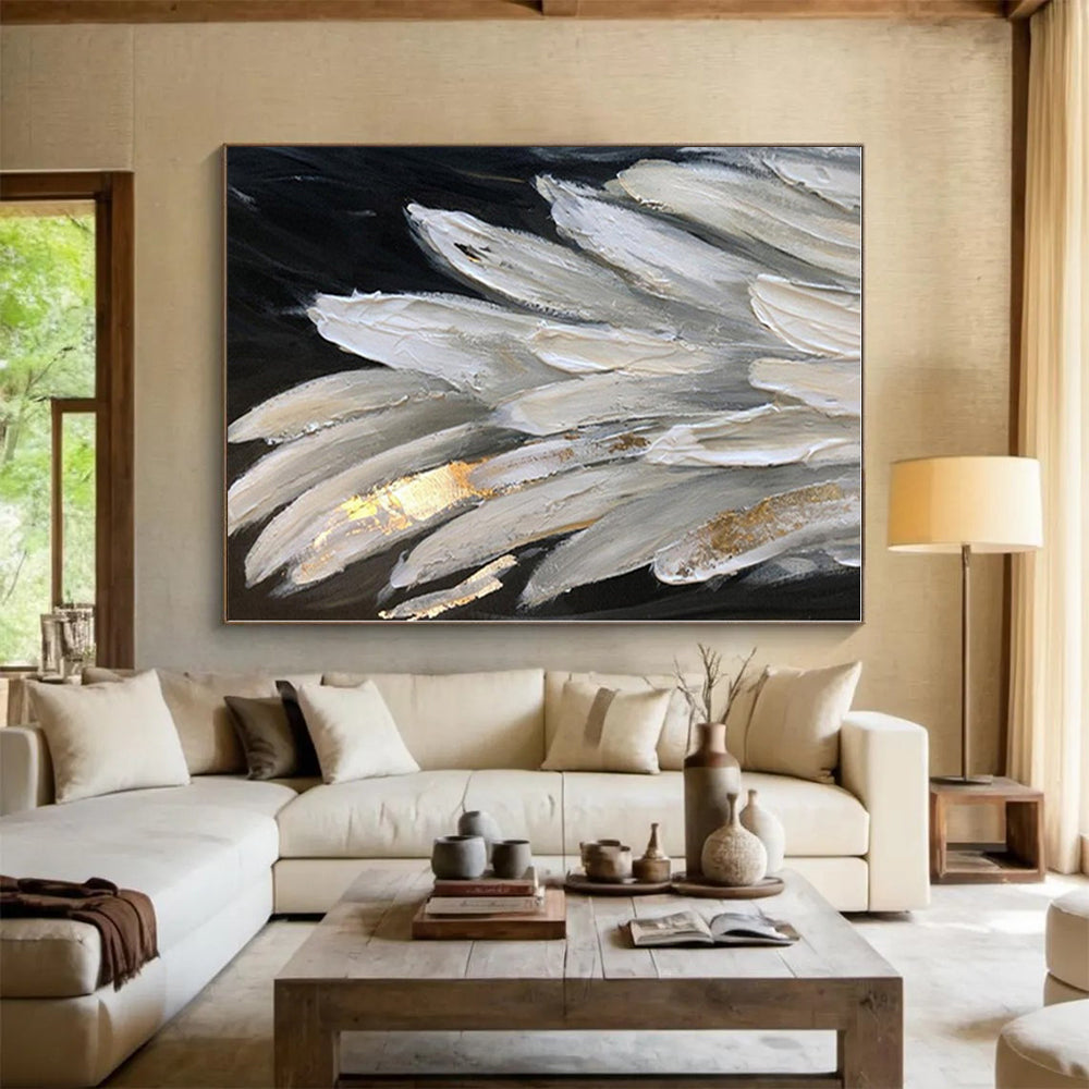 An artist found a single white feather with a hint of gold in a meadow, and it sparked a sense of wonder and lightness. They wanted to capture that delicate beauty on a grand scale. Using thick, white paint and gold accents, they painted the feather’s layers, making each “feather” feel soft and touchable. This oversized artwork is great for a bedroom, adding a touch of elegance and whimsy, or a boutique hotel, enhancing the space with a unique, artistic charm. The artist painted with care, focusing on the fine details of the feather’s texture and the subtle gold highlights. Each stroke was like building a feather, layer by layer. Hang it, and let your space be filled with the lightness and beauty of a golden feather, turning your room into a place of gentle dreams and refined style. Packaging: Each artwork is professionally rolled and secured in a durable hard-shell tube for safe transit with a 2–3 inch white border around the painting for easy stretching or framing at your local shop. Delivery Timeline: Expect your painting within 7–12 business days including 3–5 days for handcrafting by our artists and 5–7 days for worldwide delivery via UPS or FedEx with a tracking number provided immediately upon shipping.
