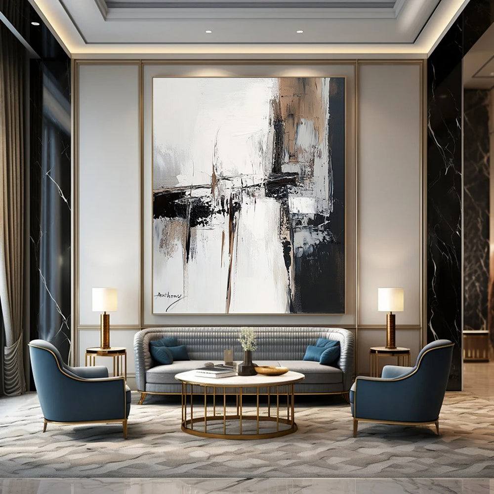 Inspired by city architecture, Anthony deconstructed buildings into abstract shapes. Using blacks and whites, he created a sense of structure and space, like looking at a city skyline through a dreamy lens. He played with light and shadow, letting the paint create depth and mystery. Hang it in a minimalist living room to add a touch of modern artistry or a modern office to inspire big - picture thinking. It’s a work that bridges the gap between reality and abstraction, turning your space into a modern urban landscape. Packaging: Each artwork is professionally rolled and secured in a durable hard-shell tube for safe transit with a 2–3 inch white border around the painting for easy stretching or framing at your local shop. Delivery Timeline: Expect your painting within 7–12 business days including 3–5 days for handcrafting by our artists and 5–7 days for worldwide delivery via UPS or FedEx with a tracking number provided immediately upon shipping.