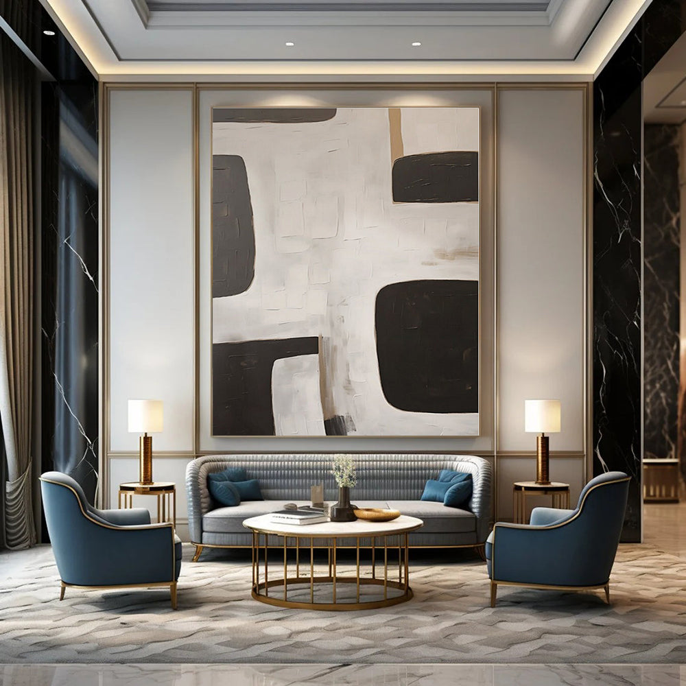 The artist was fascinated by the simplicity of geometric forms and the contrast between black and white. They started by sketching basic shapes on paper, then translated those onto a large canvas, carefully layering paint to create a sense of depth. Each block was painted with precision, but there's an organic feel to the edges, as if the shapes are gently merging. It took days of adjusting and repainting to get the balance just right. This piece is perfect for a modern minimalist office, adding a touch of sophistication, or a monochrome living room, becoming the focal point of the space. Hang it up, and let it bring a sense of order and calm, a reminder of the beauty in simplicity. Packaging: Each artwork is professionally rolled and secured in a durable hard-shell tube for safe transit with a 2–3 inch white border around the painting for easy stretching or framing at your local shop. Delivery Timeline: Expect your painting within 7–12 business days including 3–5 days for handcrafting by our artists and 5–7 days for worldwide delivery via UPS or FedEx with a tracking number provided immediately upon shipping.