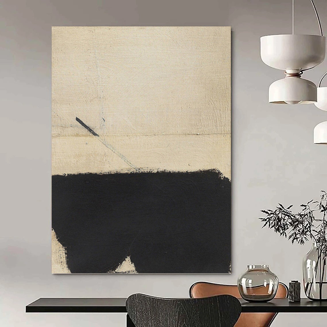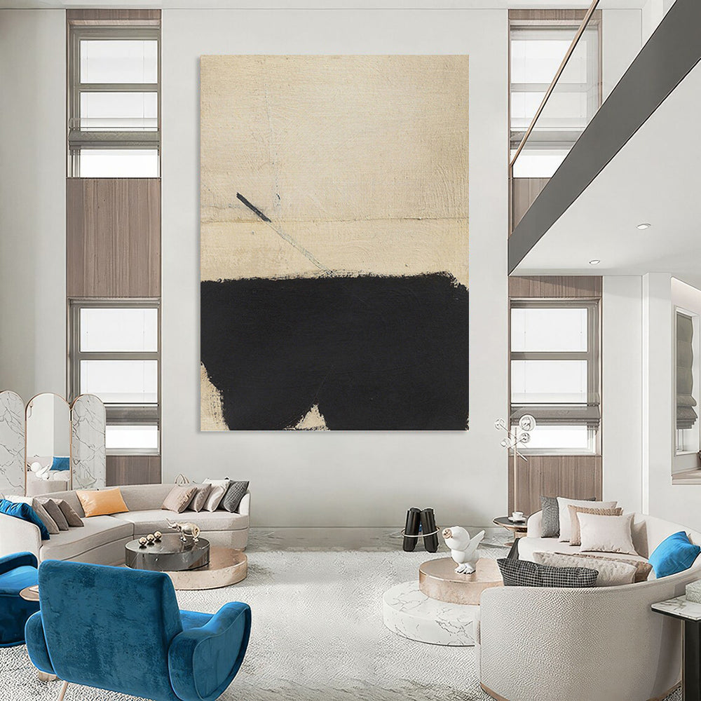 Channeling the bold, gestural style of Franz Kline, this painting features a large black shape on a beige canvas. The artist was inspired by the energy of urban landscapes, using strong lines and contrast. Perfect for a modern living room to make a bold statement or a home gym to inspire motivation. Let Kline - like energy and powerful contrast invigorate your space—own an abstract force.
