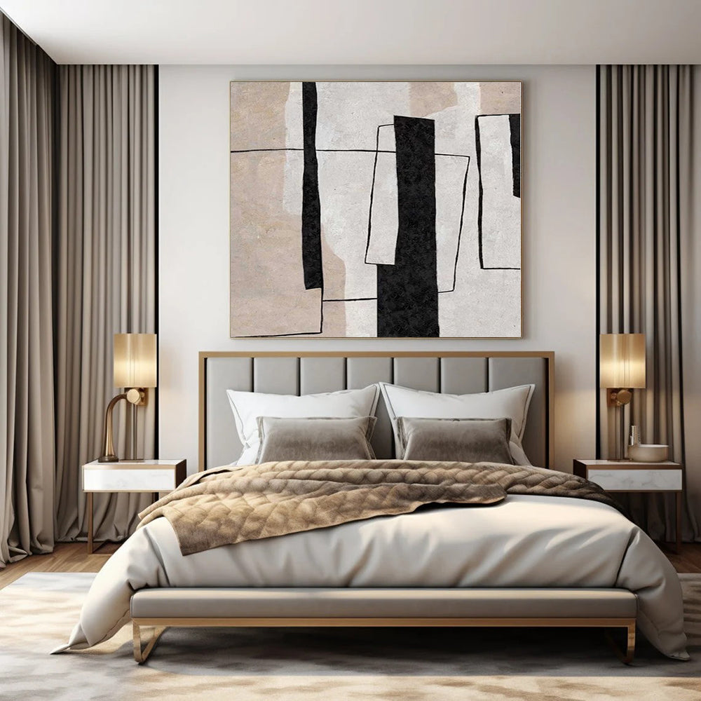 Inspired by the clean lines of modern design, the artist wanted to create a piece that celebrates simplicity and structure. Using black and white on a neutral background, they arranged geometric shapes to create a sense of balance and order. It’s ideal for a modern office, adding a touch of sleek sophistication, or a minimalist gallery, showcasing the power of abstract form. The artist carefully planned each shape’s placement, ensuring a cohesive, visually striking composition. It’s a testament to the beauty of less is more, inviting viewers to appreciate the subtle interactions between the lines and forms. Let this painting bring a sense of calm order to your space, a modern masterpiece that speaks volumes with its simplicity. Packaging: Each artwork is professionally rolled and secured in a durable hard-shell tube for safe transit with a 2–3 inch white border around the painting for easy stretching or framing at your local shop. Delivery Timeline: Expect your painting within 7–12 business days including 3–5 days for handcrafting by our artists and 5–7 days for worldwide delivery via UPS or FedEx with a tracking number provided immediately upon shipping.
