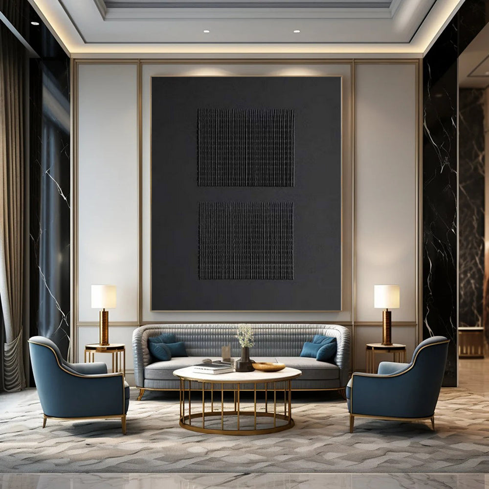 Add a sleek, modern touch to your study with this hand - crafted art. Two big, textured black squares on a dark backdrop create a bold, minimalist look. The large size makes a strong statement, perfect for a study that values clean lines and a hand - painted feel. Packaging: Each artwork is professionally rolled and secured in a durable hard-shell tube for safe transit with a 2–3 inch white border around the painting for easy stretching or framing at your local shop. Delivery Timeline: Expect your painting within 7–12 business days including 3–5 days for handcrafting by our artists and 5–7 days for worldwide delivery via UPS or FedEx with a tracking number provided immediately upon shipping.