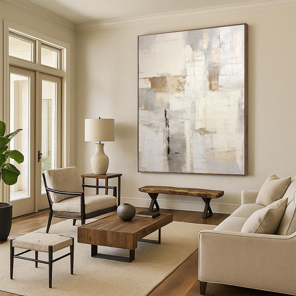 Motivated by the simplicity of modern geometric design, the artist used textured brushstrokes to create a neutral, yet visually interesting piece. They focused on the contrast between different neutral shades. Perfect for a minimalist living room, adding a subtle, artistic touch, or a home office, inspiring organized, creative thinking. Elevate your minimalist decor—this art blends simplicity and texture seamlessly.