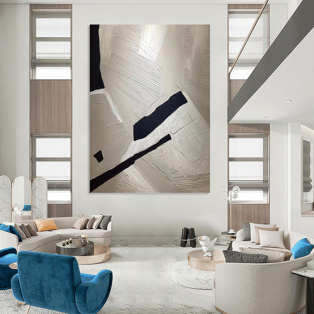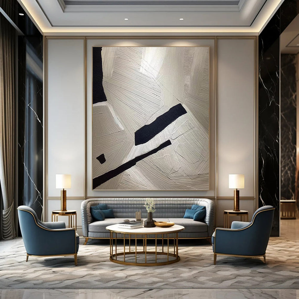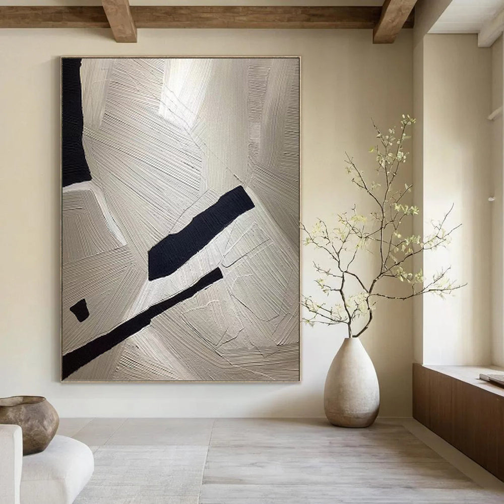 Enchanted by the precision of geometric patterns, the artist used thick, textured brushstrokes to create white and black shapes. They focused on the contrast between smooth and rough textures. Great for a study, inspiring organized thinking, or a modern kitchen, adding a sleek, artistic element. Embrace geometric precision—this art adds a structured, yet creative touch.