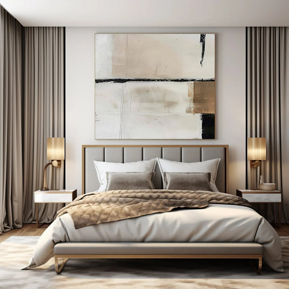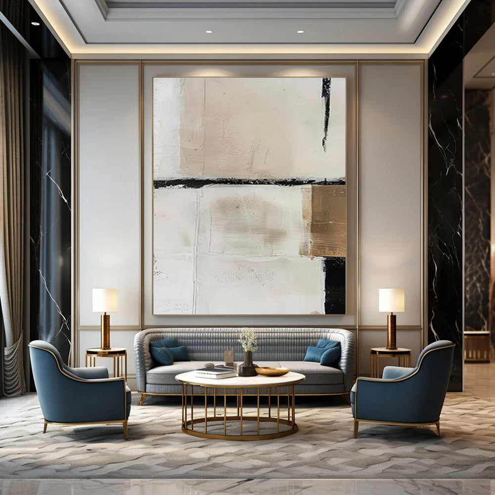 The artist was chasing the feeling of quiet luxury. They started with a base of soft whites, then introduced stark black lines, imagining the contrast as a play between light and shadow in a high - end space. Finally, the delicate gold accents were added, like hidden treasures. Working slowly, they let each layer dry and interact, creating a depth that draws you in. This painting elevates a luxury bedroom, adding a touch of opulence, or a chic lounge, enhancing the sophisticated ambiance. It’s a story of refinement, where every stroke and color choice is a step towards crafting an atmosphere of understated grandeur. Packaging: Each artwork is professionally rolled and secured in a durable hard-shell tube for safe transit with a 2–3 inch white border around the painting for easy stretching or framing at your local shop. Delivery Timeline: Expect your painting within 7–12 business days including 3–5 days for handcrafting by our artists and 5–7 days for worldwide delivery via UPS or FedEx with a tracking number provided immediately upon shipping.