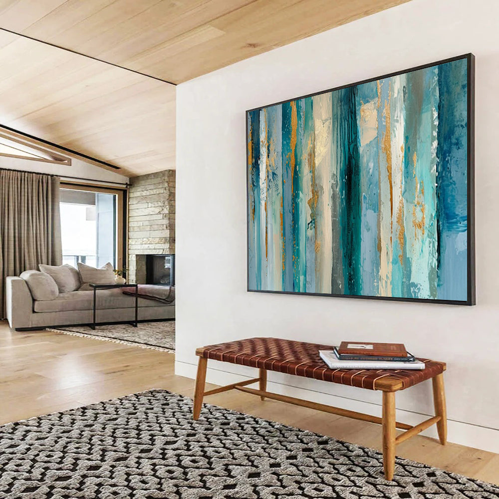 Elevate the grandeur of hotel lobbies with this hand - painted blue and gold vertical strokes acrylic art. The blend of cool blues and opulent golds creates a sophisticated, upscale atmosphere. Each stroke is meticulously crafted by hand, adding a touch of artistic luxury. It serves as a captivating centerpiece, welcoming guests with a sense of refined elegance, making every arrival a memorable experience. Packaging: Each artwork is professionally rolled and secured in a durable hard-shell tube for safe transit with a 2–3 inch white border around the painting for easy stretching or framing at your local shop. Delivery Timeline: Expect your painting within 7–12 business days including 3–5 days for handcrafting by our artists and 5–7 days for worldwide delivery via UPS or FedEx with a tracking number provided immediately upon shipping.