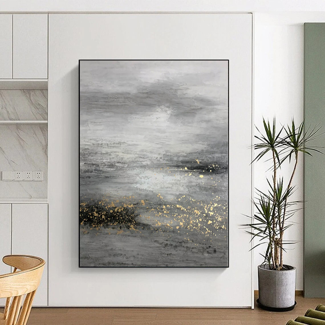 The oversized gray - gold abstract landscape acrylic painting is full of mystery and luxury. The artist looked at old black - and - white photos of landscapes and thought, “What if there were golden moments?” They added gold splatters, like hidden treasures in a gray world. The brushstrokes are soft, creating a dreamy atmosphere. In a luxury bedroom, it’s a calming yet glamorous backdrop for sleep. In a sophisticated office, it brings a touch of elegance, inspiring big ideas. This large - scale work is a journey to a golden - accented world, ready to add luxury to your space. Packaging: Each artwork is professionally rolled and secured in a durable hard-shell tube for safe transit with a 2–3 inch white border around the painting for easy stretching or framing at your local shop. Delivery Timeline: Expect your painting within 7–12 business days including 3–5 days for handcrafting by our artists and 5–7 days for worldwide delivery via UPS or FedEx with a tracking number provided immediately upon shipping.