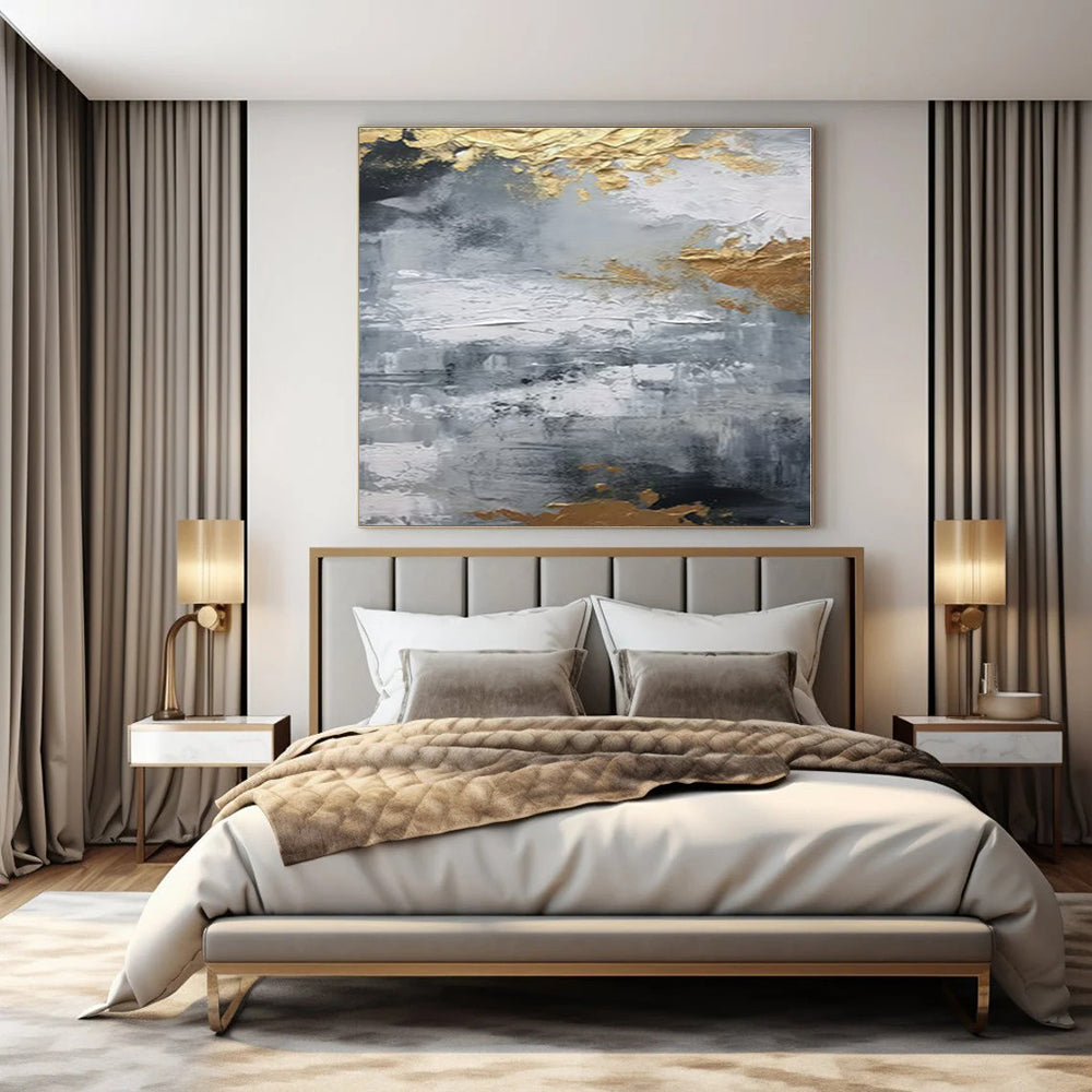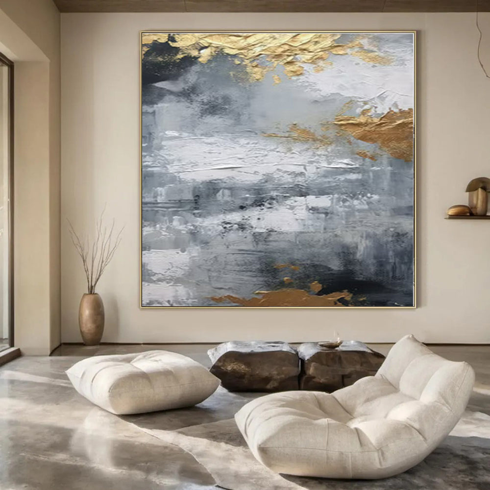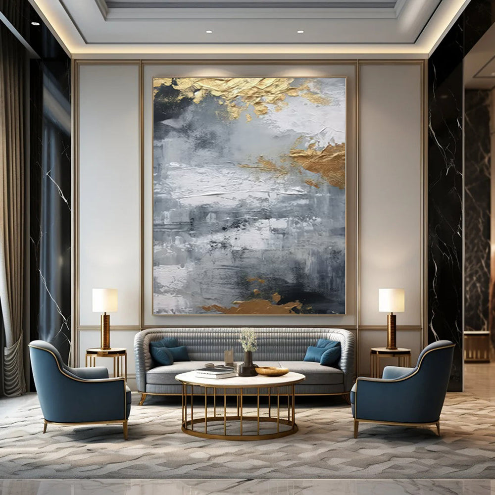 Building on the gray - gold theme, the artist added more texture and larger gold patches. They imagined an industrial office where raw walls meet luxurious art. The rough gray mimics concrete, while gold adds warmth. Ideal for an industrial - chic office, balancing edgy and elegant, or a modern hallway, making a bold first impression. The artist used heavy textures, almost sculpting the canvas, then let the gold leaf catch the light. It’s a piece that commands attention, perfect for spaces that love contrast. Packaging: Each artwork is professionally rolled and secured in a durable hard-shell tube for safe transit with a 2–3 inch white border around the painting for easy stretching or framing at your local shop. Delivery Timeline: Expect your painting within 7–12 business days including 3–5 days for handcrafting by our artists and 5–7 days for worldwide delivery via UPS or FedEx with a tracking number provided immediately upon shipping.