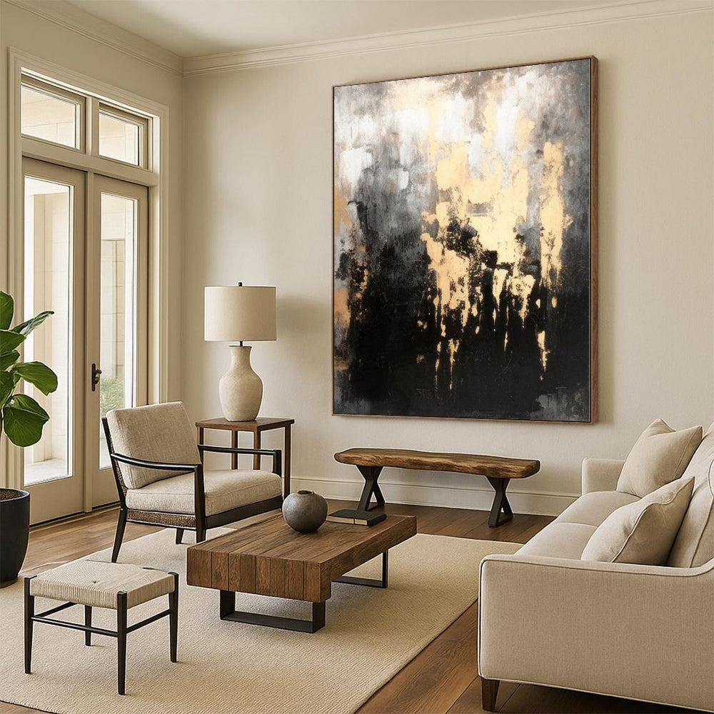 The enormous dark gold - gray abstract acrylic painting is all about sophistication and depth. The artist was inspired by old libraries and the wisdom they hold, using dark gold and gray tones. The process was about creating a sense of mystery and knowledge. In a sophisticated home library, it's perfect. Imagine the artist, carefully painting these tones to evoke a feeling of timelessness. This large artwork can turn your home library into a space of intellectual charm, with the artist's exploration of depth and sophistication now enhancing your reading and thinking moments. Packaging: Each artwork is professionally rolled and secured in a durable hard-shell tube for safe transit with a 2–3 inch white border around the painting for easy stretching or framing at your local shop. Delivery Timeline: Expect your painting within 7–12 business days including 3–5 days for handcrafting by our artists and 5–7 days for worldwide delivery via UPS or FedEx with a tracking number provided immediately upon shipping.