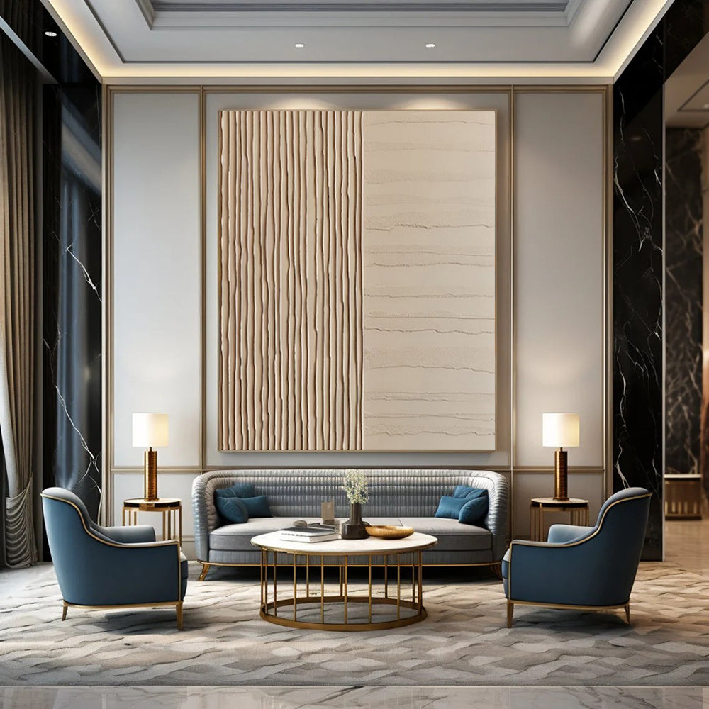 Drawing from the minimalist and textural style of Sol LeWitt, this piece features beige textured stripes. The artist used acrylic to create deep, tactile lines and smooth surfaces. Great for a modern office to add a minimalist statement or a hallway to create a sense of rhythm. Let the textured stripes and neutral tones bring a modern, minimalist feel—own a piece of artistic rhythm.