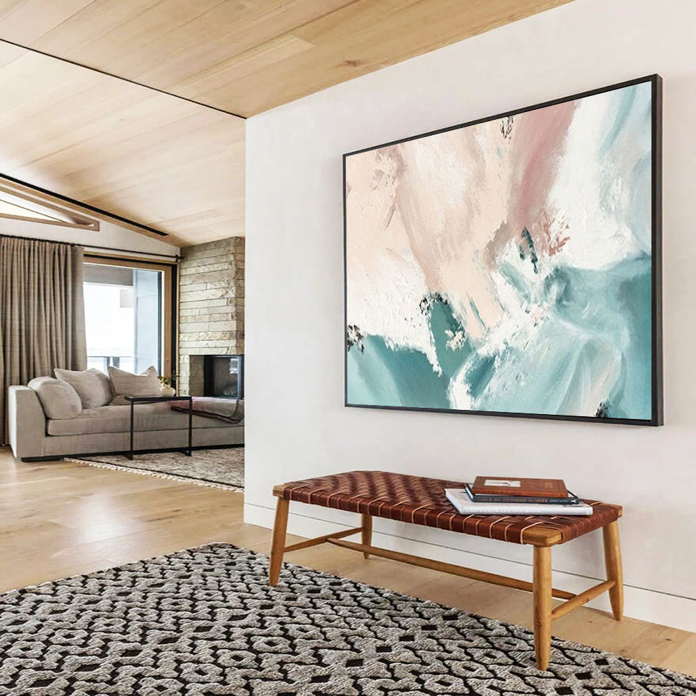 Taking cues from the fluid abstracts of Helen Frankenthaler, the artist let intuition guide them. They started by pouring blush - toned paint onto the canvas, then reacted to its flow with teal strokes, creating a sense of gentle movement. The free - form brushstrokes are meant to mimic the unpredictability of ocean tides or a summer breeze. It’s an ideal fit for a modern minimalist bedroom, adding a subtle pop of color and soft energy, or a chic home office, where its calming hues can help focus your mind. This isn’t just decor— it’s a conversation - starting piece that shows you value art with soul.