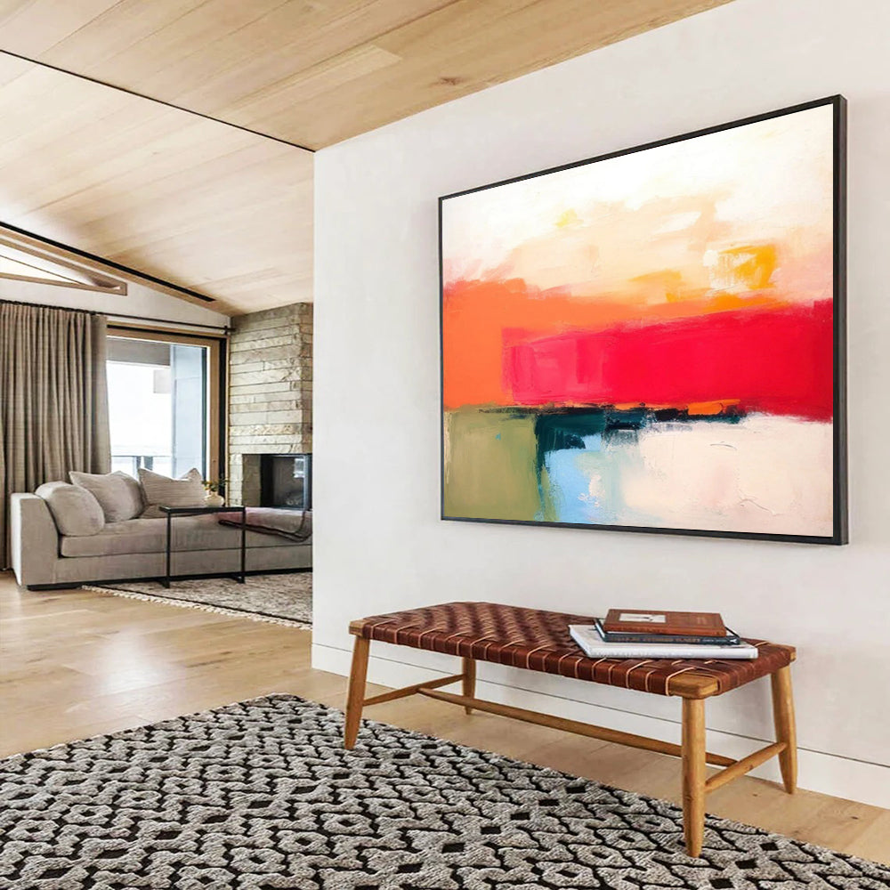Inspired by the color field paintings of Mark Rothko, the artist used large blocks of bright colors. Thinking of a summer meadow, they applied thick acrylics. Great for a contemporary art gallery wall or a creative studio. This painting makes a bold statement. Own it to showcase your artistic taste.