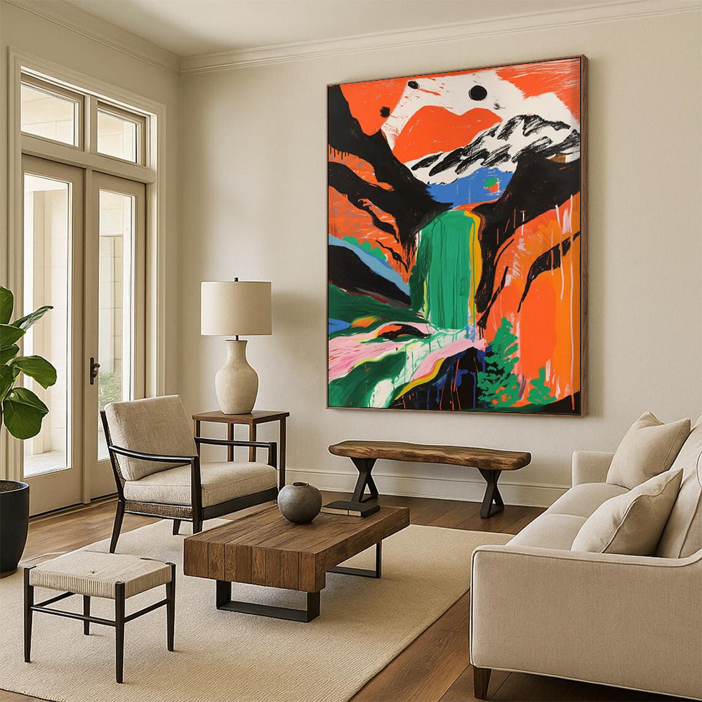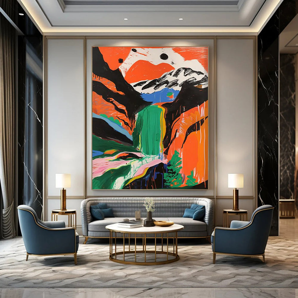 Inspired by a tropical waterfall, the artist used free - flowing colors and bold brushstrokes to capture the waterfall’s dynamic energy. The style is abstract yet evocative, similar to contemporary landscape art. Perfect for a beach house or a spa to bring the refreshing vibe of nature. Hang it, and let your space be washed over by the vibrant beauty of this artistic waterfall.