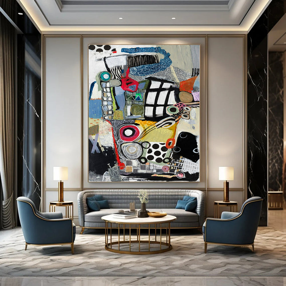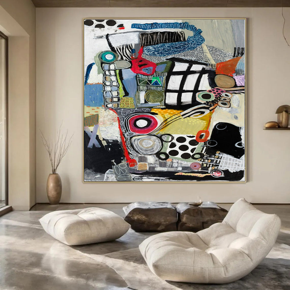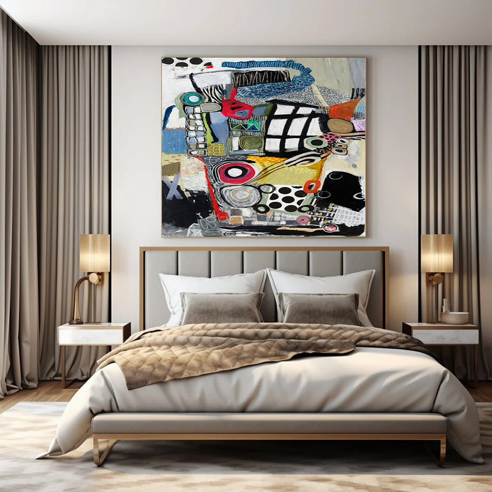 With this piece, the artist aimed to create a colorful, engaging work that appeals to both kids and adults. The mix of patterns, colors, and shapes is like a visual playground. It’s perfect for a modern playroom, stimulating young minds, or an artistic retail space, adding a unique, creative touch. The artist drew inspiration from children’s art and the joy of playful creativity, then added their own artistic twist. Each element in the collage is a nod to fun and imagination. Hang this painting and let its playful energy bring a smile to your face, turning your space into a creative haven. Packaging: Each artwork is professionally rolled and secured in a durable hard-shell tube for safe transit with a 2–3 inch white border around the painting for easy stretching or framing at your local shop. Delivery Timeline: Expect your painting within 7–12 business days including 3–5 days for handcrafting by our artists and 5–7 days for worldwide delivery via UPS or FedEx with a tracking number provided immediately upon shipping.
