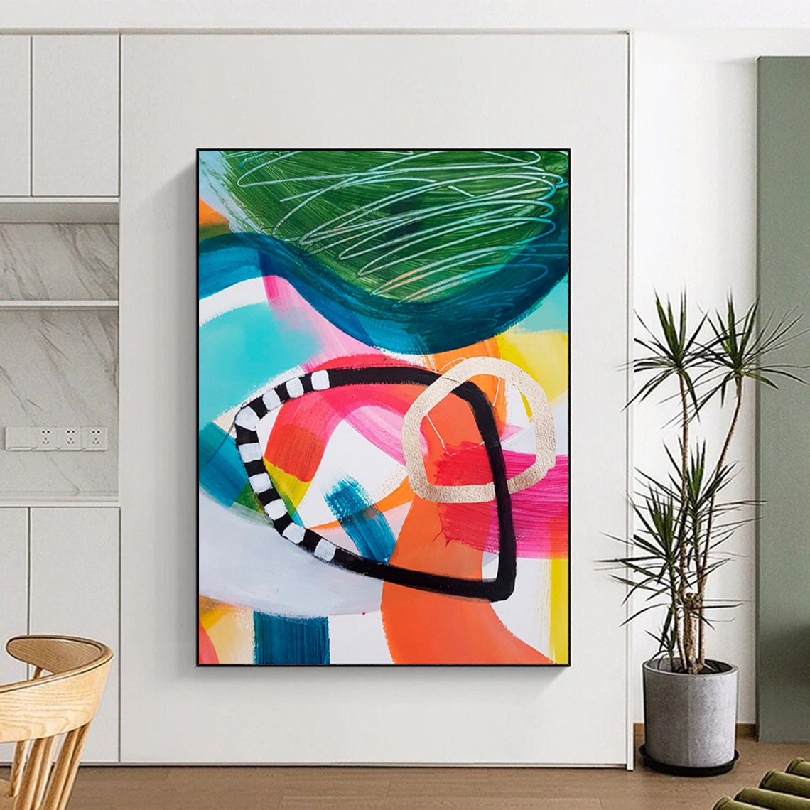 The artist was on a quest to break free from artistic boundaries. They experimented with mixing unexpected color combinations—think the clash of neon pink and emerald green—and using unorthodox tools, like sponges and palette knives, to create texture. The result is a composition that’s both chaotic and harmonious, like a symphony of colors playing off one another. The bold black and white striped shape and the metallic gold circle act as anchors, drawing the eye amidst the colorful chaos. This piece is a statement of creative rebellion. Hang it in an eclectic office to inspire out - of - the - box thinking or a creative classroom to show students the power of artistic experimentation. It’s a testament to the idea that art thrives when rules are bent, a visual explosion born from the artist’s desire to push the limits of what abstract art can be. Packaging: Each artwork is professionally rolled and secured in a durable hard-shell tube for safe transit with a 2–3 inch white border around the painting for easy stretching or framing at your local shop. Delivery Timeline: Expect your painting within 7–12 business days including 3–5 days for handcrafting by our artists and 5–7 days for worldwide delivery via UPS or FedEx with a tracking number provided immediately upon shipping.