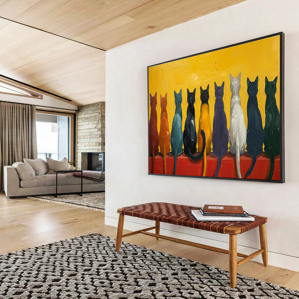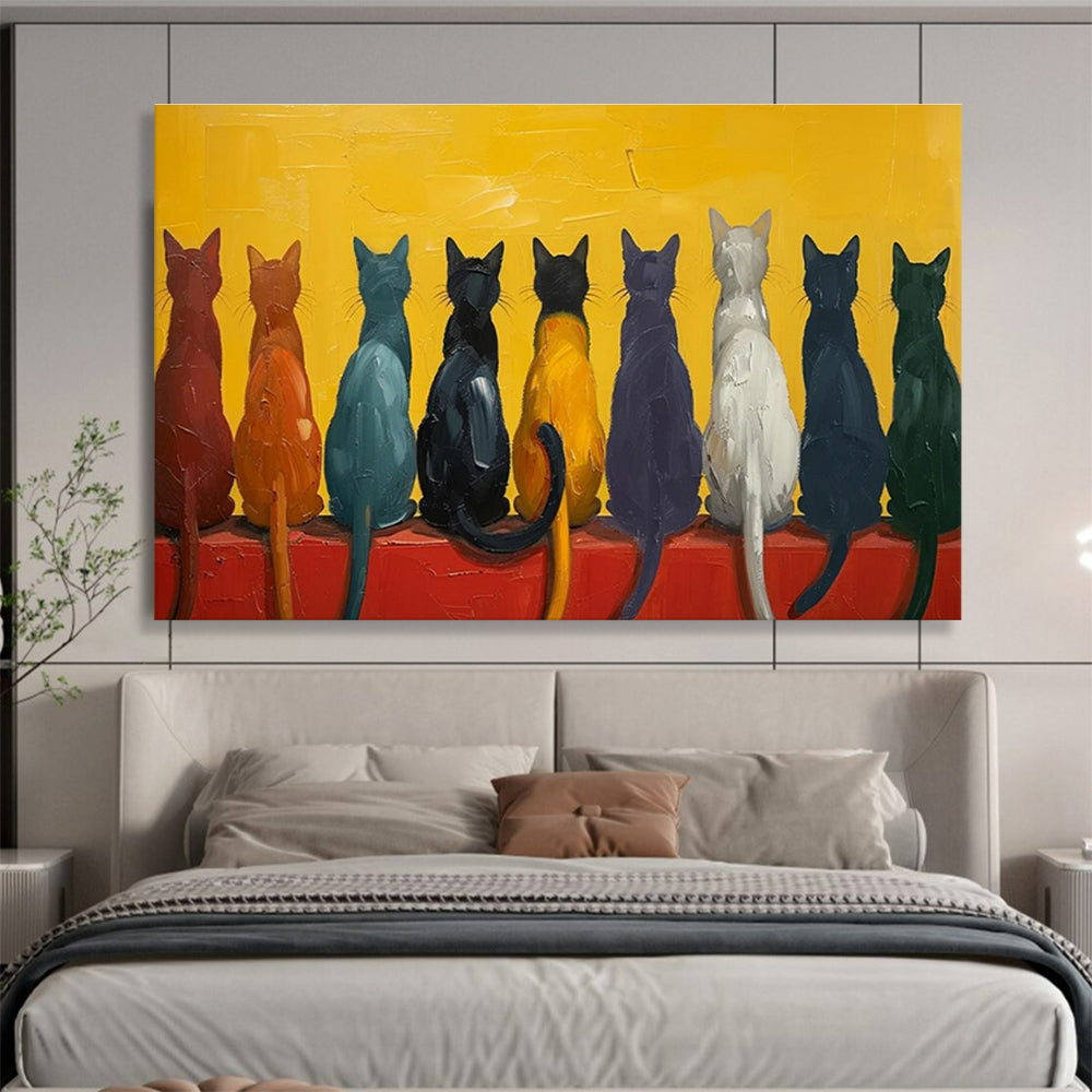 Inspired by cat lovers’ joy, the artist painted a row of cats in vibrant colors against a bright background. They used playful brushstrokes and bold hues, wanting to celebrate feline charm. Ideal for a cat café, adding a fun focal point, or a pet - owner’s bedroom, showcasing love for cats. The artist hoped to make viewers smile at the colorful, quirky scene, bringing happiness. This work is a celebration of pets, a lively addition to any space.