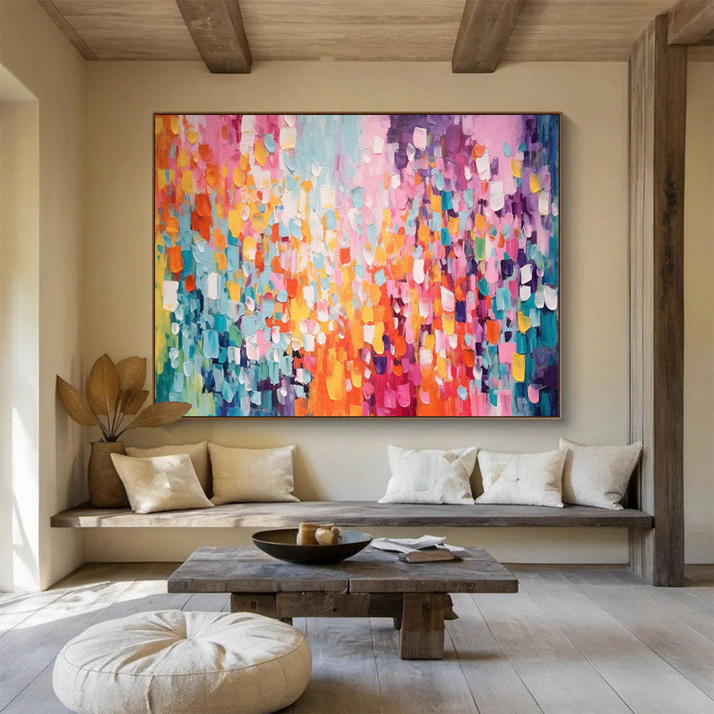 Drawing from Yayoi Kusama's dot art, the artist, inspired by a summer meadow, dotted vibrant acrylics. Ideal for a child's room, sparking imagination, or a colorful hallway, making a playful statement. Add a fun, artistic touch to your home.