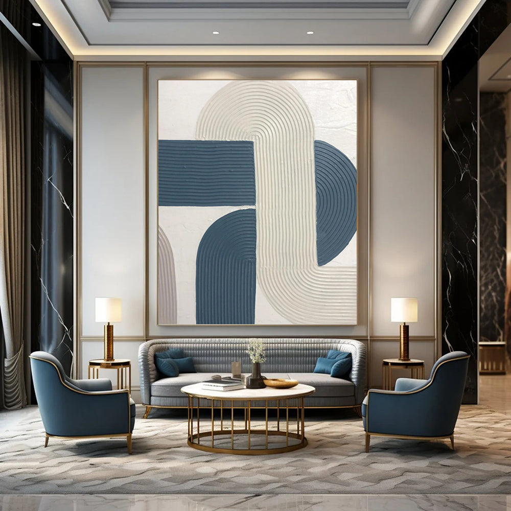 “Curved Ribbon Textures” - White, Blue Abstract Art on Canvas DKH1163