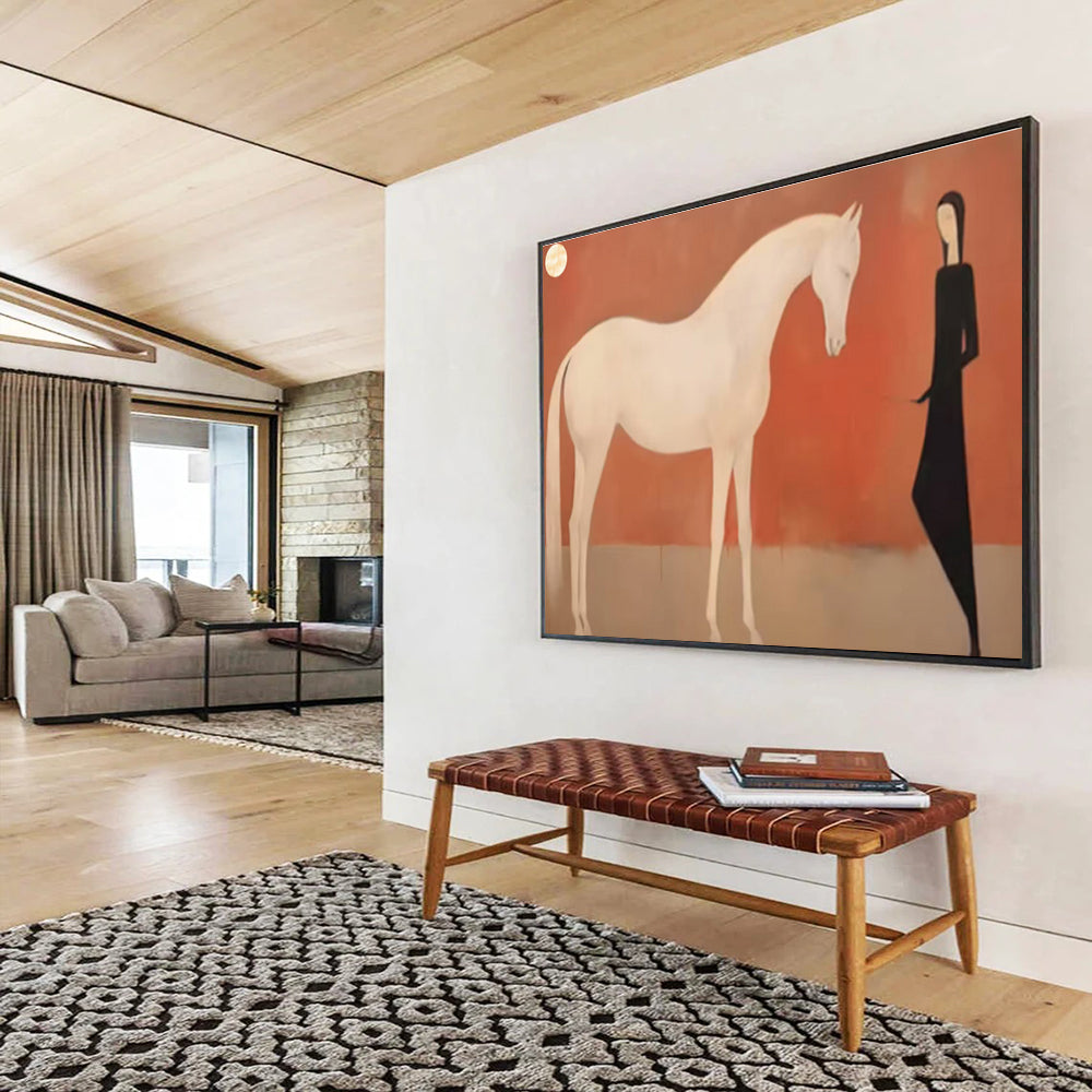 The artist was inspired by the relationship between a horse and a figure, using simple shapes and colors to create a minimalist abstract piece. They aimed to evoke a sense of connection and tranquility. Perfect for a study, adding a thought - provoking touch, or a modern home, showcasing figurative abstract art. While painting, they focused on the simplicity of the forms. It's a tribute to the connection between the horse and the figure, inviting viewers to reflect.