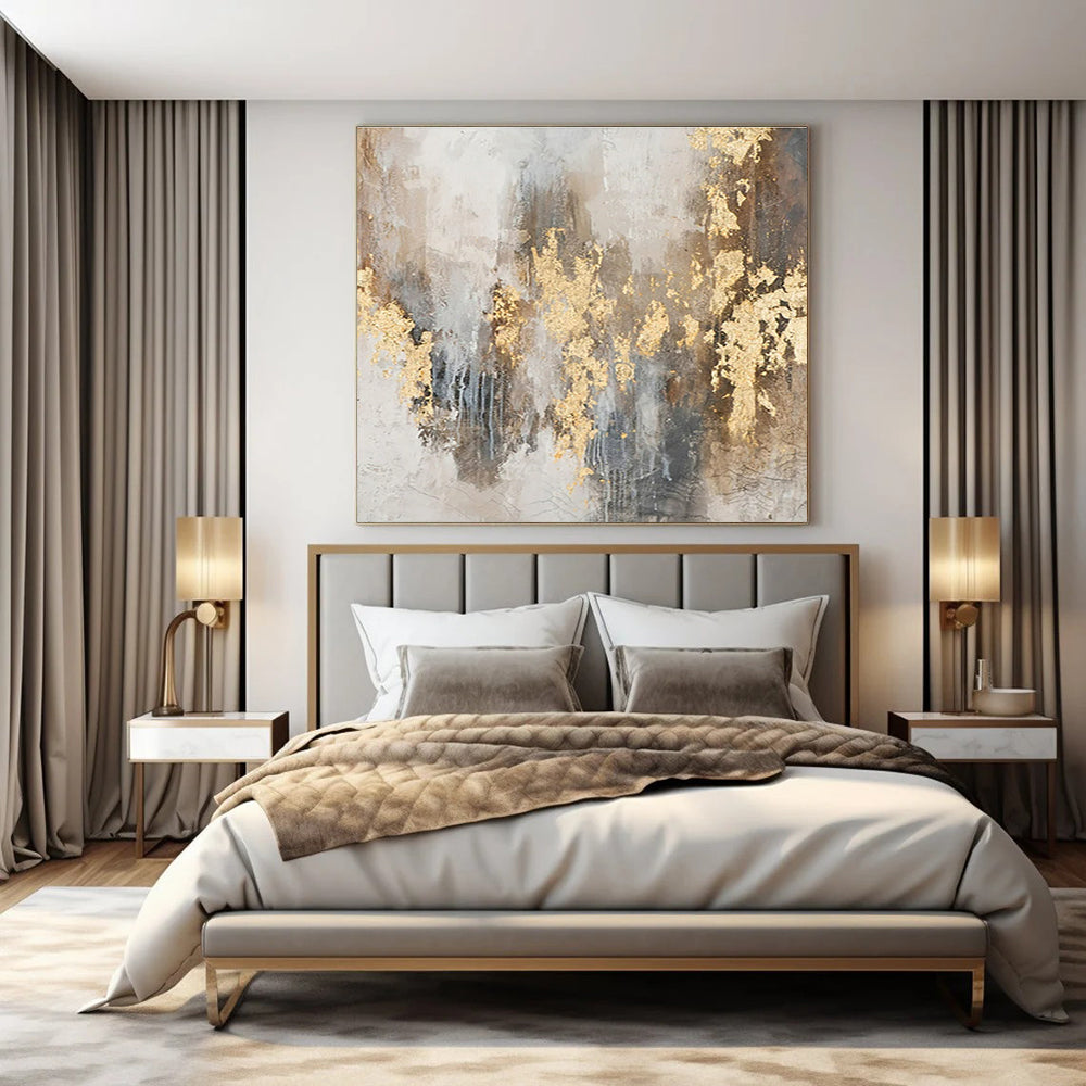 Captivated by the glow of gold against muted grays, the artist aimed for opulence. They layered smooth grays, then splashed gold, letting it drip and fade, creating a regal yet raw effect. Working with both precision and spontaneity, they balanced the rich gold with understated tones. Hang it in a luxury bedroom for a touch of glamour, or an upscale lounge to elevate the ambiance. It’s a dance of luxury and restraint, each gold streak a moment of bold creativity. Packaging: Each artwork is professionally rolled and secured in a durable hard-shell tube for safe transit with a 2–3 inch white border around the painting for easy stretching or framing at your local shop. Delivery Timeline: Expect your painting within 7–12 business days including 3–5 days for handcrafting by our artists and 5–7 days for worldwide delivery via UPS or FedEx with a tracking number provided immediately upon shipping.