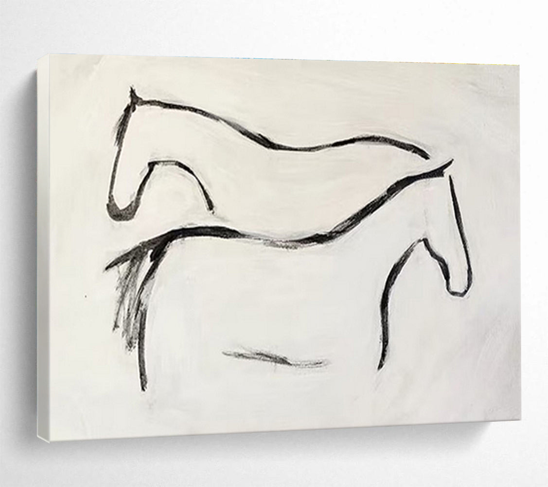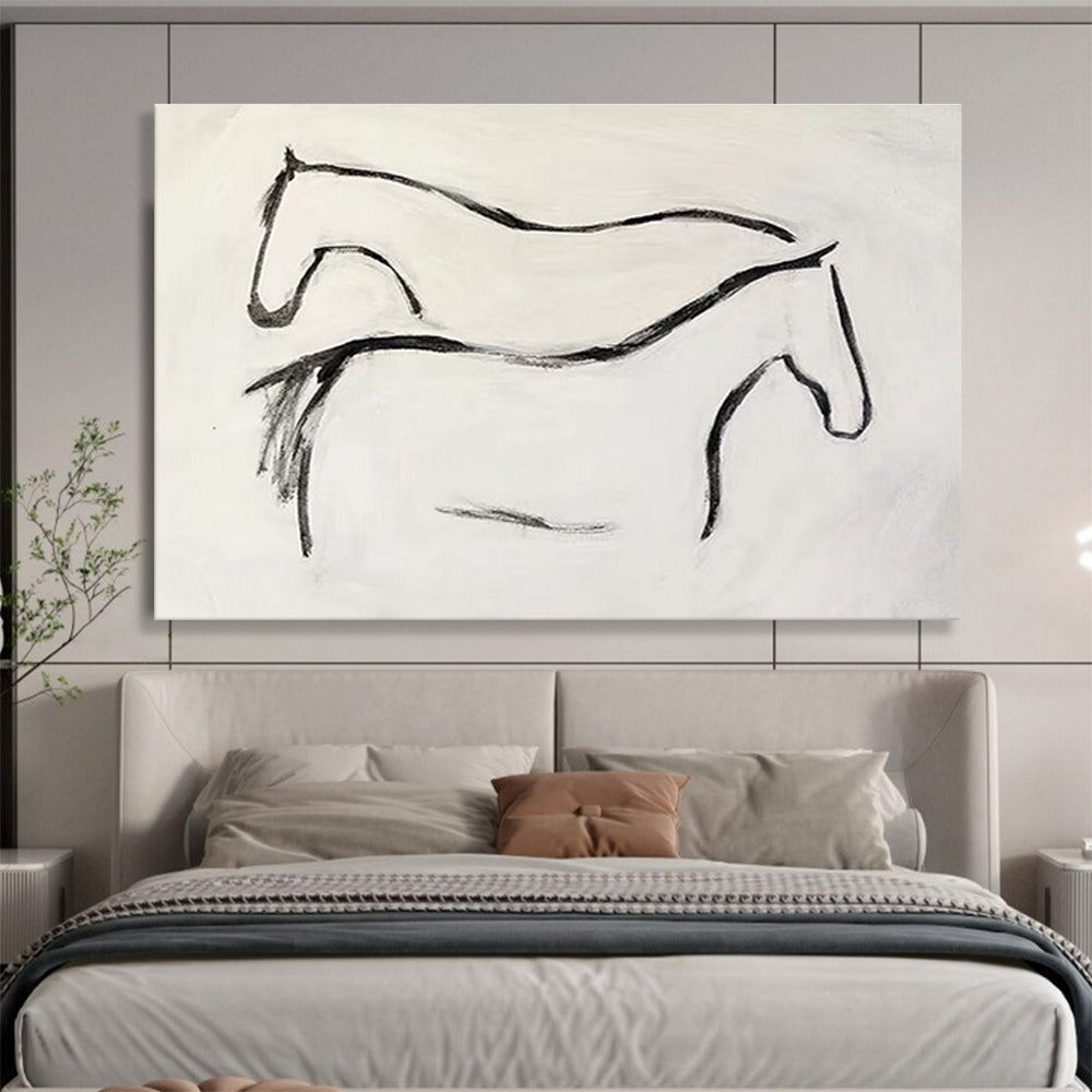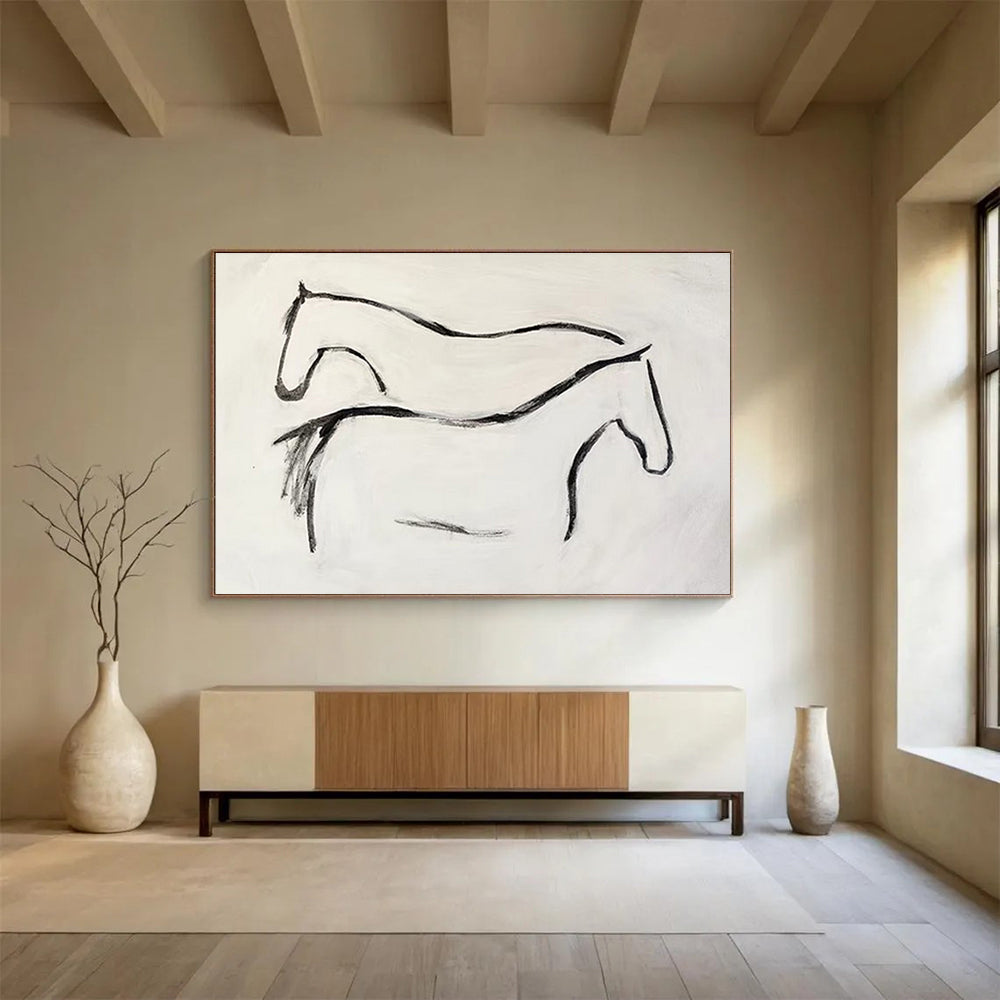The artist was inspired by the grace of horses, using simple black lines on a white background to capture their elegance. They aimed for a minimalist, yet expressive style. Ideal for a modern stable or a minimalist living room, adding a touch of artistic charm. As they painted, they focused on the fluidity of the horse forms. It's a celebration of equine grace, inviting viewers to appreciate the simplicity and beauty.