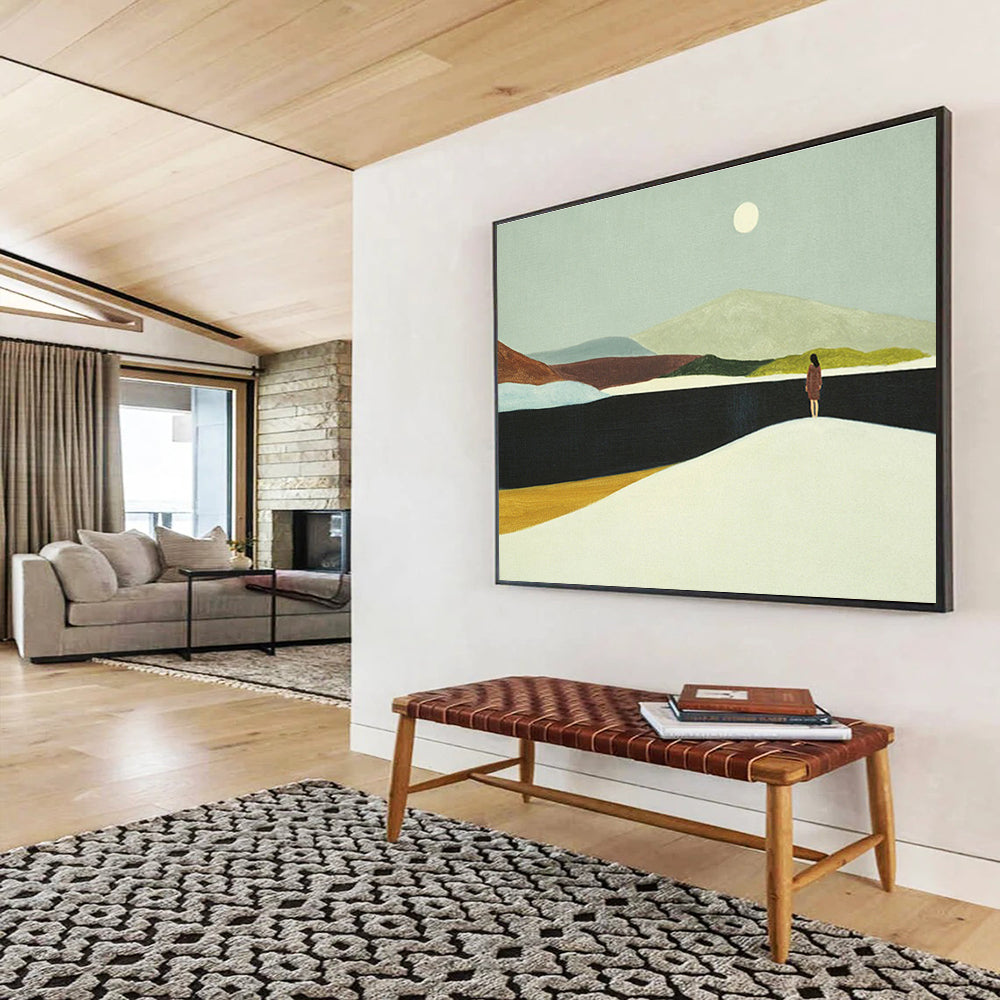 Drawn to the quiet beauty of a moonlit landscape, the artist used a minimalist approach to create a scene of a figure contemplating nature. They wanted to evoke a sense of peace and introspection. Great for a bedroom, adding a calming touch, or a yoga studio, enhancing the meditative ambiance. During painting, they focused on the simplicity of the forms and the mood of the scene. It's a celebration of quiet contemplation, inviting viewers to connect with nature and their inner selves.