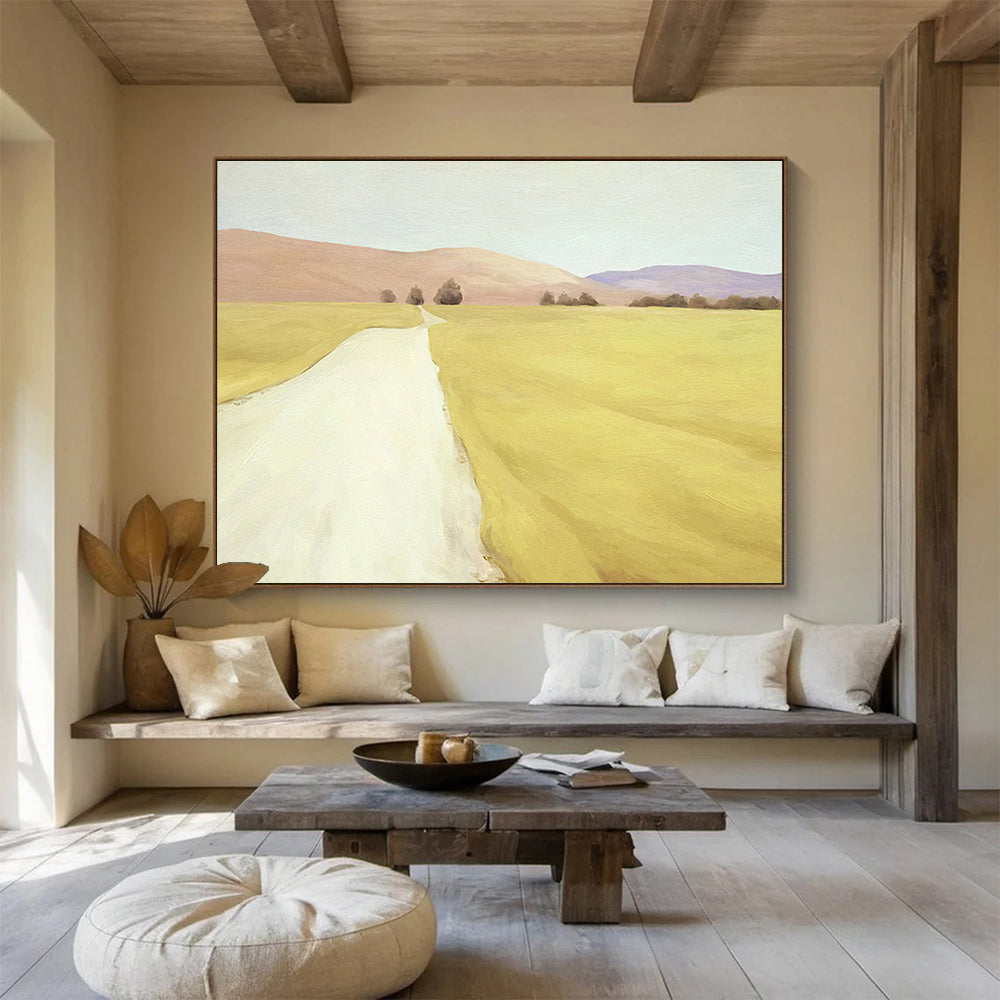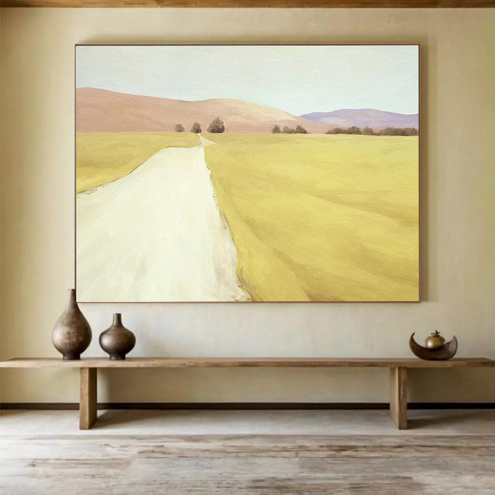 Drawn to the simplicity of a countryside scene, the artist used a minimalist approach with dominant yellow tones to create a peaceful landscape with a winding path. They wanted to evoke a sense of calm and exploration. Perfect for a country - style kitchen, adding a rustic touch, or a home office, enhancing the focused ambiance. While painting, they focused on the smooth texture of the paint and the simplicity of the forms. It's a tribute to rural calm and the allure of a yellow pathway, inviting viewers to take a mental stroll.