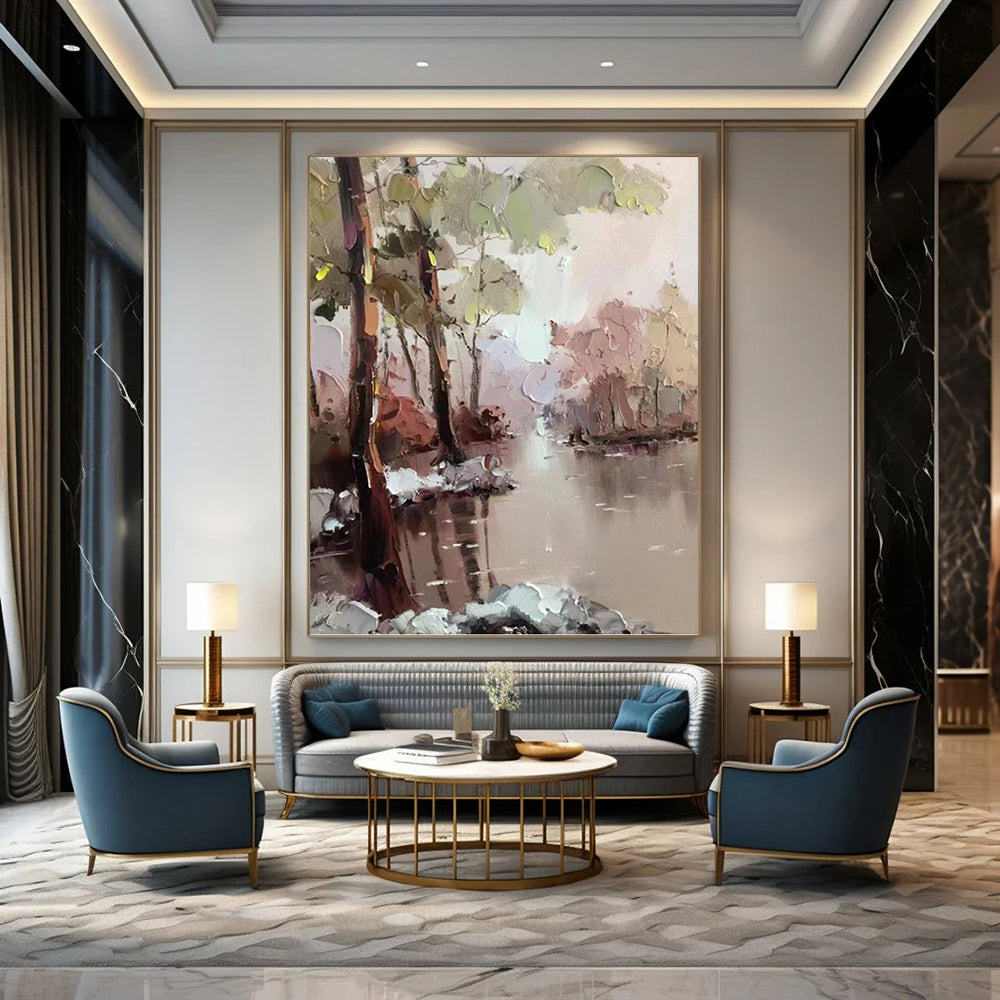 The artist was inspired by gentle morning walks along quiet riverbanks. They used soft pastels to blend the greens of trees, the pinks of distant foliage, and the calm tones of the water. Layer by layer, they built a scene that feels like a peaceful escape. It’s perfect for a bedroom to add a dreamy, restful vibe or a living room to create a cozy, inviting atmosphere. Hang this piece and let your space be filled with the tranquility of a hidden riverbank—bring home a slice of serenity.