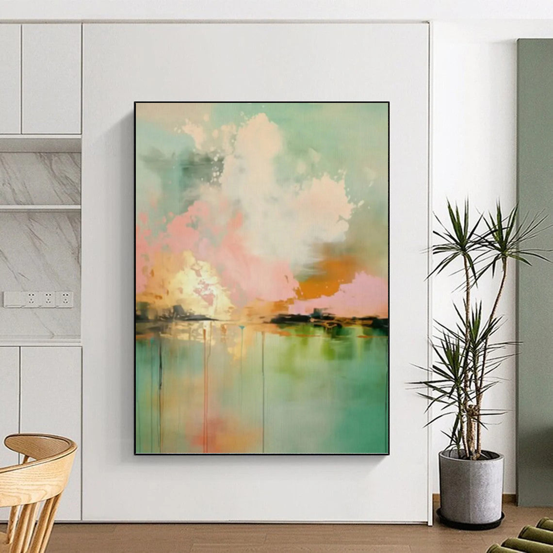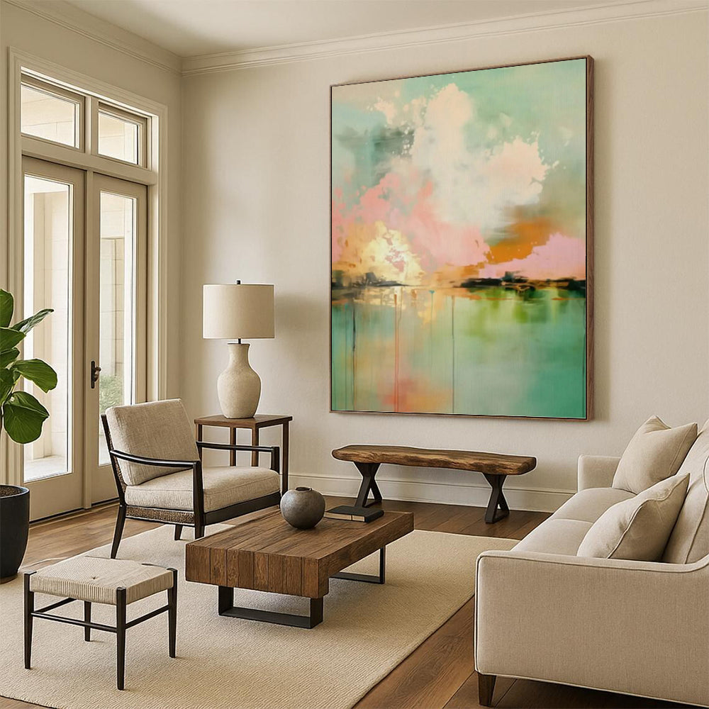 Fascinated by the reflection of a sunset on water, the artist used soft pastels to create a dreamy scene where the sky and water blend together. The gentle drips of color mimic the way the sunset’s hues bleed into the water, creating a sense of peace and tranquility. This artwork is ideal for a bathroom, where its serene tones can create a spa - like atmosphere, or a cozy living room corner, adding a touch of calm. The artist’s process involved layering the pastels carefully, building up the colors to create a seamless blend between the sky and water. It’s a piece that brings the beauty of a peaceful sunset reflection into your home, helping you escape into a world of calm.