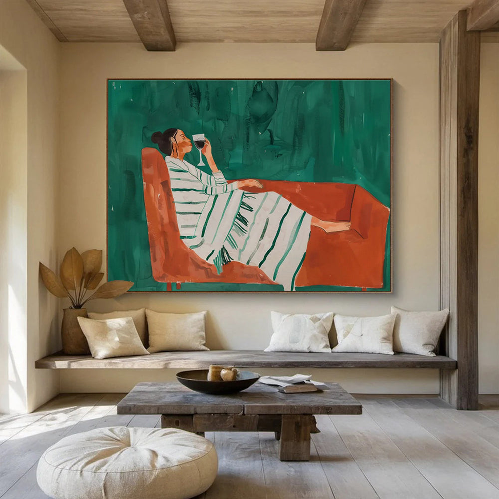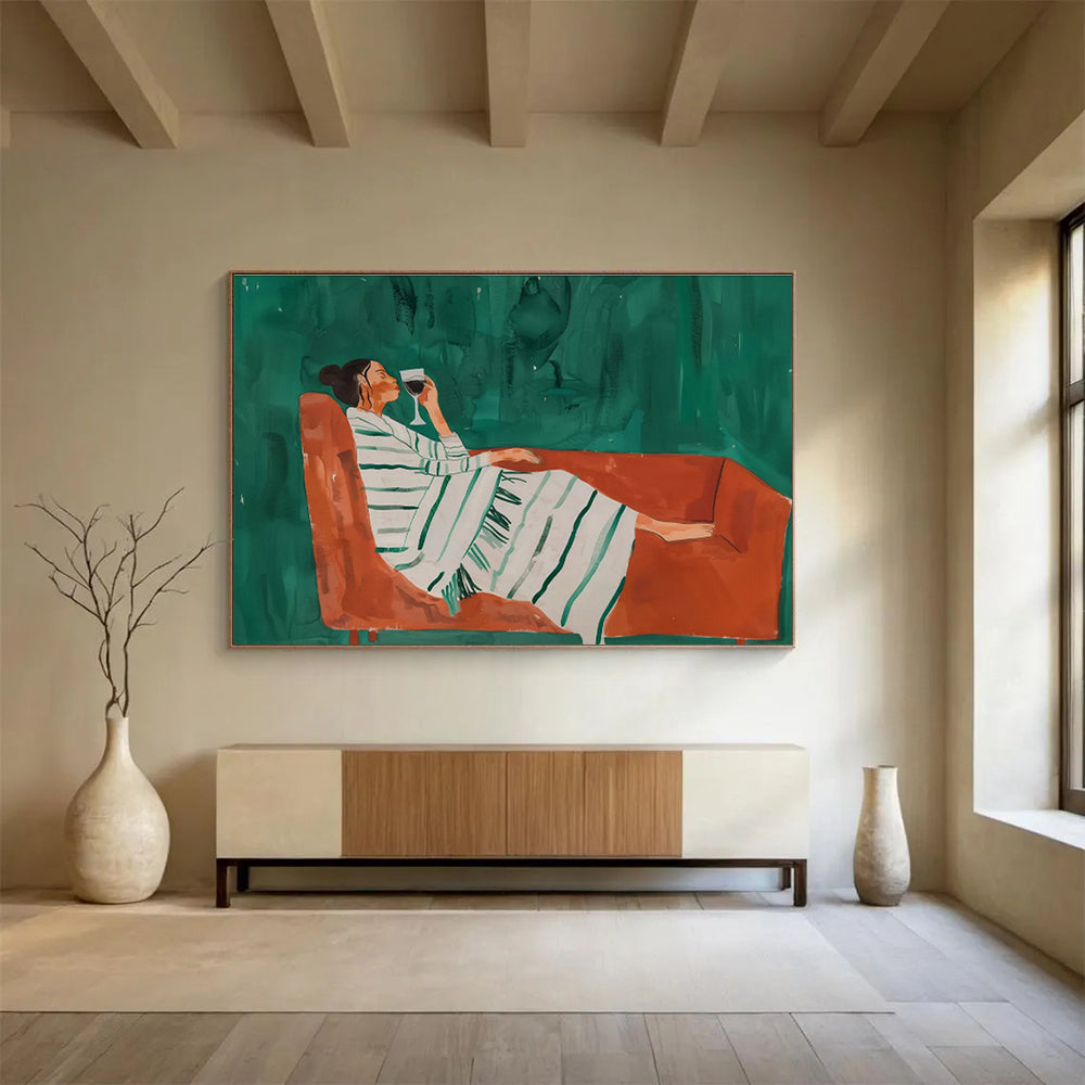 The artist observed a friend unwinding with a glass of wine, capturing the calm in loose brushstrokes and contrasting colors. They aimed to freeze a moment of self - care, using the orange couch to pop against the green background. It’s a toast to relaxation—perfect for a modern living room to encourage downtime or a wine bar to set a mellow mood. This painting is a quiet cheers, each stroke a sip of peace. Packaging: Each artwork is professionally rolled and secured in a durable hard-shell tube for safe transit with a 2–3 inch white border around the painting for easy stretching or framing at your local shop. Delivery Timeline: Expect your painting within 7–12 business days including 3–5 days for handcrafting by our artists and 5–7 days for worldwide delivery via UPS or FedEx with a tracking number provided immediately upon shipping.