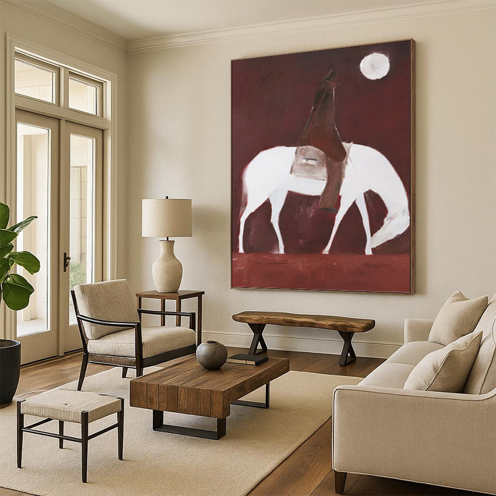 Inspired by the symbolic, minimalist works of Kazimir Malevich, this painting shows a rider on a white horse against a deep red backdrop. The artist aimed to capture a sense of nobility and simplicity, using strong shapes. Perfect for a study to inspire ambition or a hallway to add a touch of grandeur. Let Malevich - like symbolism and noble simplicity inspire your space—own a figurative masterpiece.