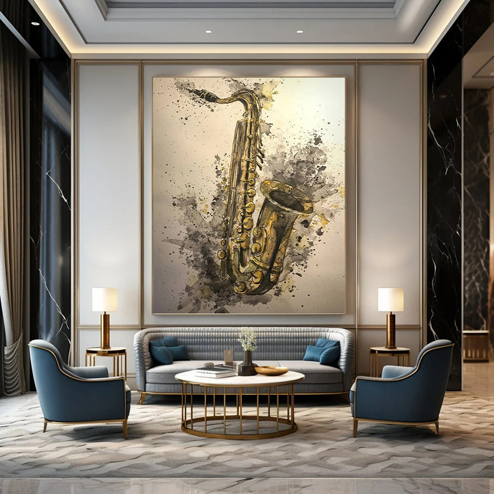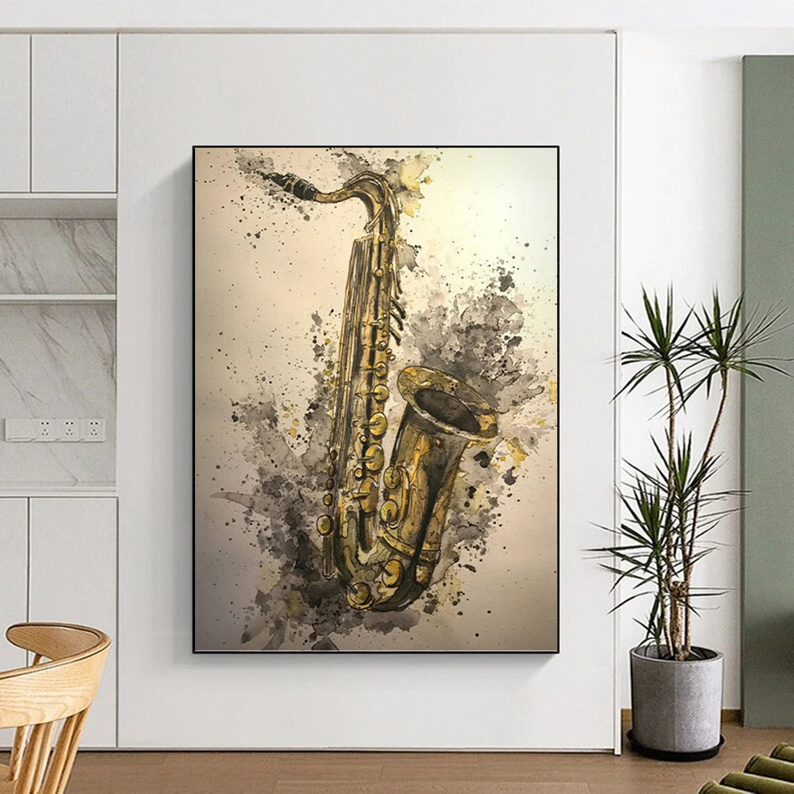 This saxophone artwork uses watercolor splashes to create a sense of musical improvisation. The artist, inspired by jazz music and free - flowing art, aimed to capture the soul of the sax. Ideal for a music - themed living room or a jazz bar - inspired space. Let this saxophone serenade your walls—own a piece of artistic melody.