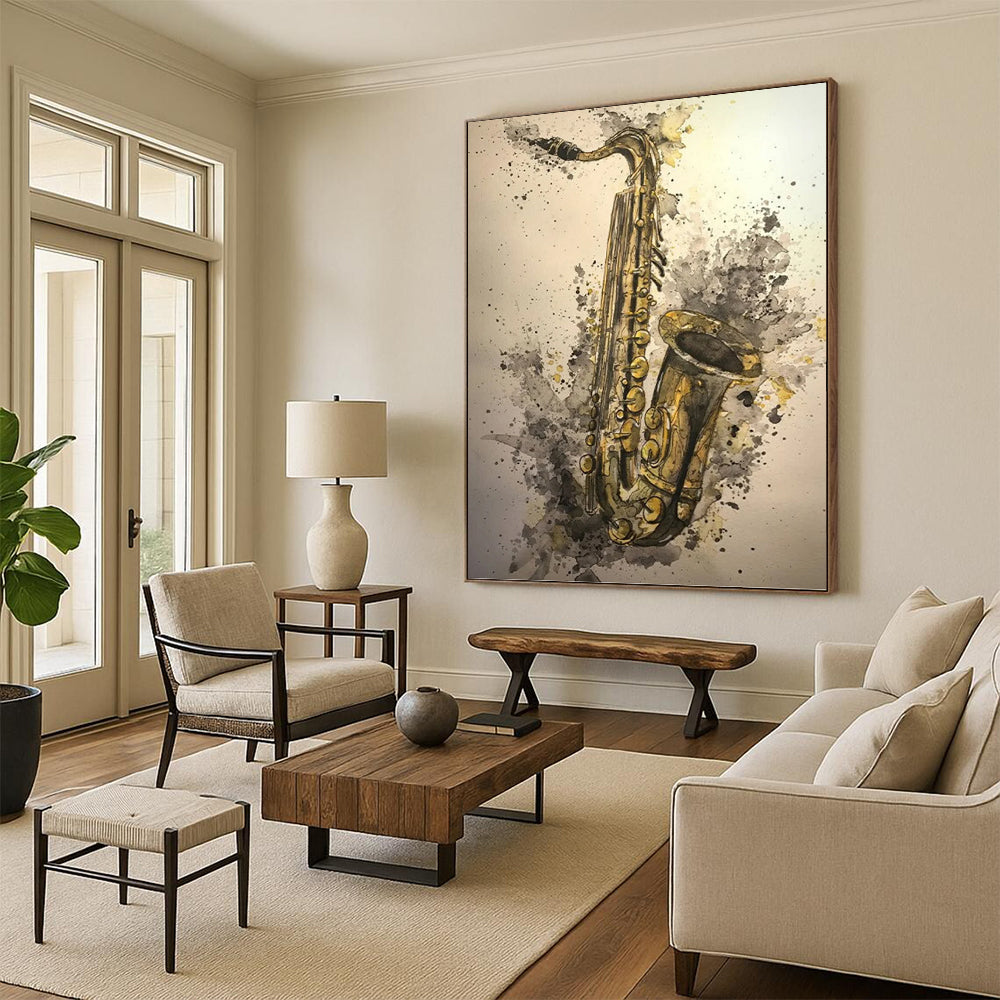 “Saxophone in Watercolor Splashes” - Abstract Musical Art on Canvas DKH1640