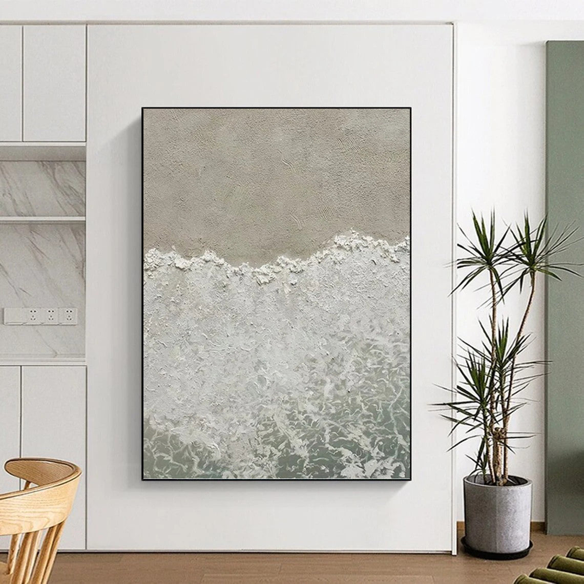 Drawn to the peaceful view of a beach from above, the artist used beige and white to capture the soft meeting of sand and sea. The textured layers mimic the gentle waves and smooth sand. It’s ideal for a bedroom, creating a serene and restful atmosphere, or a bathroom, adding a touch of coastal calm. Let this aerial beach scene transport you to a peaceful seaside getaway.