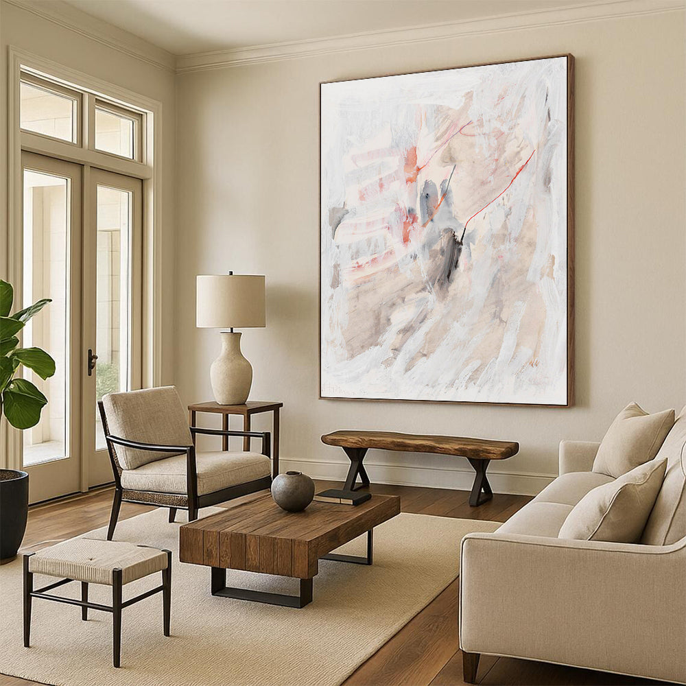 Inspired by the subtle hues of Helen Frankenthaler's works, this piece uses soft, muted tones and delicate lines. The artist layered thin acrylics, creating a gentle, dreamy atmosphere. Ideal for a bedroom to promote relaxation or a reading nook to inspire calm thoughts. Let the soft tones soothe your mind—own a piece of artistic tranquility.