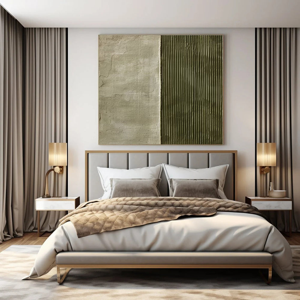 The artist was fascinated by the contrast between different textures and colors. They split the canvas into two, using a rough, textured green on one side and a smooth, muted beige on the other. The process was about creating a dialogue between the two sides, showing how different elements can come together to create a cohesive whole. It's a piece that makes you think about contrasts and balance. This abstract work is perfect for an industrial - chic loft, adding an edgy touch, or a modern art gallery wall, standing out with its unique design. Hang it, and let it spark conversations about art, design, and the beauty of contrasts. Packaging: Each artwork is professionally rolled and secured in a durable hard-shell tube for safe transit with a 2–3 inch white border around the painting for easy stretching or framing at your local shop. Delivery Timeline: Expect your painting within 7–12 business days including 3–5 days for handcrafting by our artists and 5–7 days for worldwide delivery via UPS or FedEx with a tracking number provided immediately upon shipping.