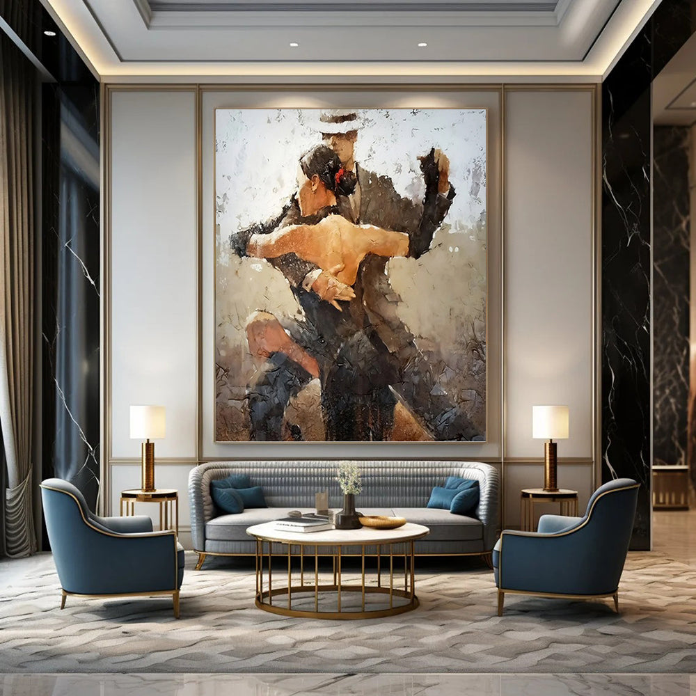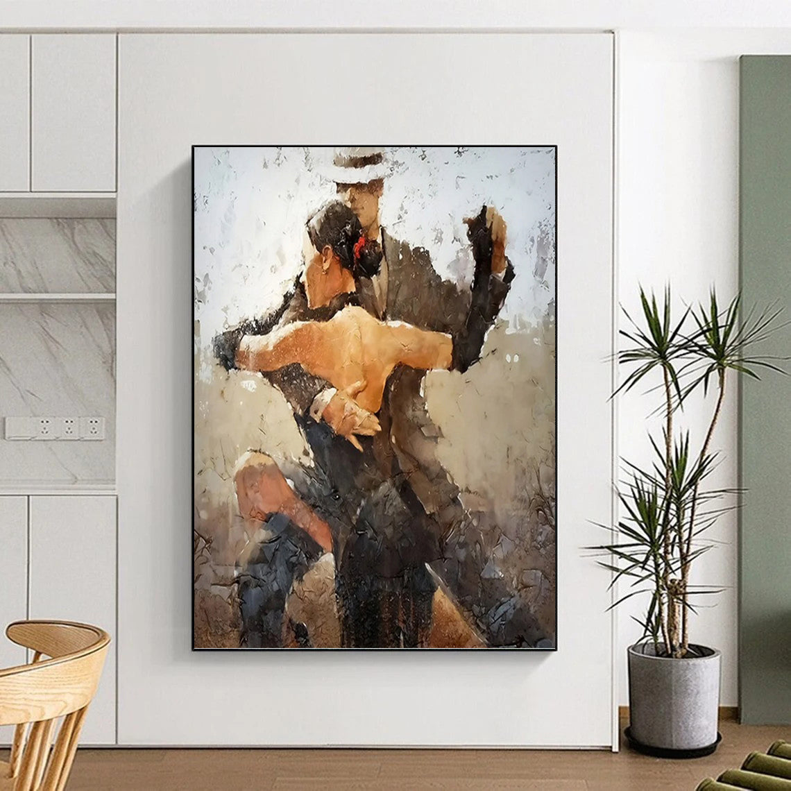 This artwork captures the passion of tango dancers with earthy, muted tones. Inspired by the fluidity of dance and impressionist brushwork, the artist aimed to convey movement and intimacy. Drawing from the style of Edgar Degas (in his dance - themed works), it's perfect for a ballroom - styled living room or a romantic dining area. Let these tango dancers bring a sense of drama—own a piece of artistic rhythm.