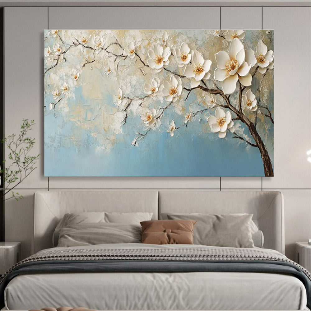 The artist was walking in a quiet garden when they spotted a blossoming tree against a soft blue sky. Captivated by the delicate white flowers and the tree's gentle branches, they used thick acrylics to create a textured, almost 3D effect. This piece is perfect for a bedroom, adding a calm, peaceful vibe, or a spa waiting room, enhancing relaxation. As they painted, they focused on layering the paint to mimic the petals' softness and the bark's roughness. It's a celebration of nature's quiet beauty, inviting viewers to pause and appreciate life's gentle moments.