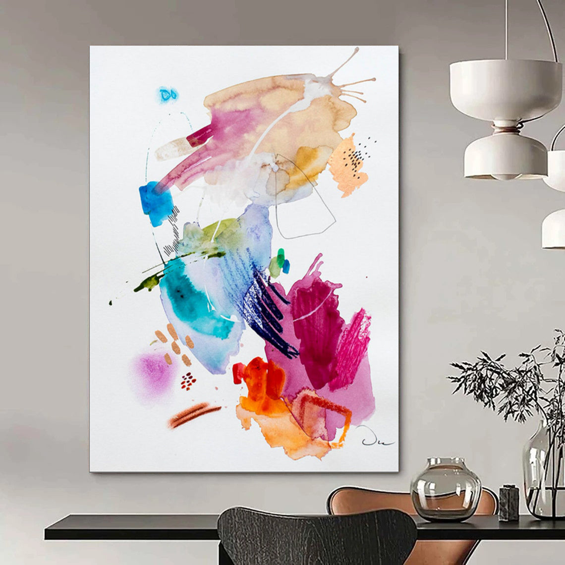 The artist thrives on the energy of bright colors and the freedom of watercolor. During a summer trip to a colorful coastal town, they were bombarded with hues of the sea, sky, and street art. Back in the studio, they let loose, splashing and dripping colors onto the paper. The goal was to capture the feeling of joy and chaos of that trip. Lines and dots were added to create a sense of rhythm among the colorful splashes. This painting is a burst of energy, perfect for an artistic living room to liven up the space or a creative classroom to inspire young minds. It's a visual representation of unbridled creativity, where each color and mark is a step on a journey of artistic exploration. Packaging: Each artwork is professionally rolled and secured in a durable hard-shell tube for safe transit with a 2–3 inch white border around the painting for easy stretching or framing at your local shop. Delivery Timeline: Expect your painting within 7–12 business days including 3–5 days for handcrafting by our artists and 5–7 days for worldwide delivery via UPS or FedEx with a tracking number provided immediately upon shipping.