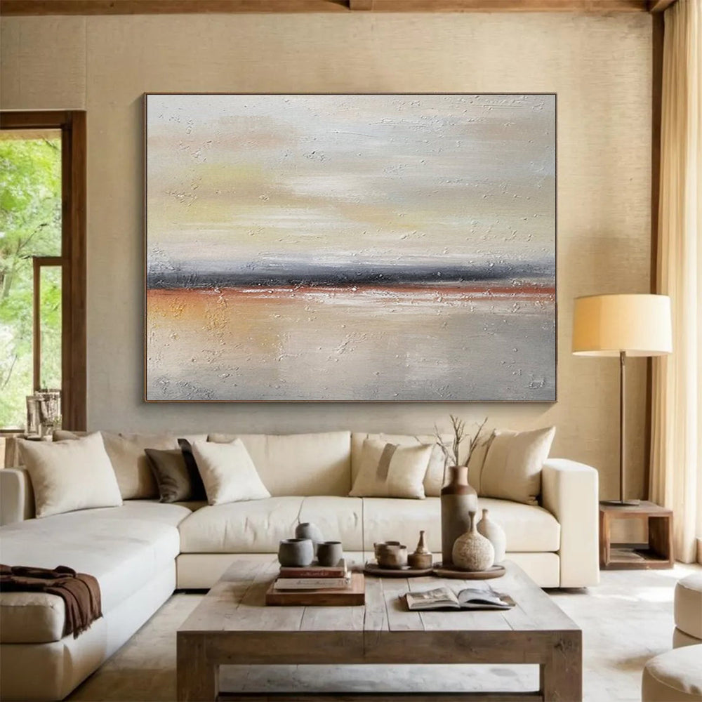 Taking inspiration from the warm, earthy palettes of Mark Rothko’s color field paintings, the artist aimed to evoke emotion through a simple horizon composition. Reflecting on the feeling of watching a gentle sunset over a flat landscape, they used layers of warm oranges, yellows, and browns to create a sense of depth and warmth. This painting is perfect for a cozy dining room, where its warm tones can enhance the intimate atmosphere during meals, or a home library, where it can add a touch of comfort and sophistication to the space. Let this artwork wrap your space in the warm embrace of a beautiful, understated horizon.