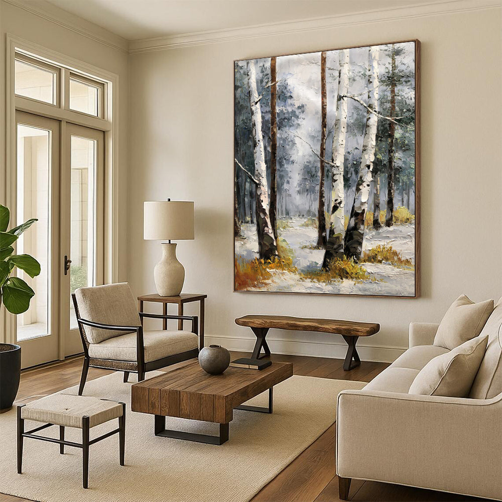 Inspired by quiet winter mornings in birch forests, the artist used cool greys and whites to depict snow - covered ground, with brown trunks and hints of yellow for undergrowth. They aimed to capture the stillness of winter. Perfect for a bedroom to create a cozy, wintry retreat or a living room to add a touch of seasonal calm. Bring the peace of winter indoors—own this serene forest.