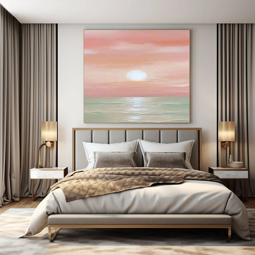 The artist dreamed of capturing the tranquil magic of coastal sunsets. They spent evenings watching the sky fade to pink, then translated that peace onto a big canvas. Each brushstroke of the soft sea and glowing sun is a step to bring the calm of the coast right into your bedroom, turning it into a serene, sunset - kissed retreat. Packaging: Each artwork is professionally rolled and secured in a durable hard-shell tube for safe transit with a 2–3 inch white border around the painting for easy stretching or framing at your local shop. Delivery Timeline: Expect your painting within 7–12 business days including 3–5 days for handcrafting by our artists and 5–7 days for worldwide delivery via UPS or FedEx with a tracking number provided immediately upon shipping.