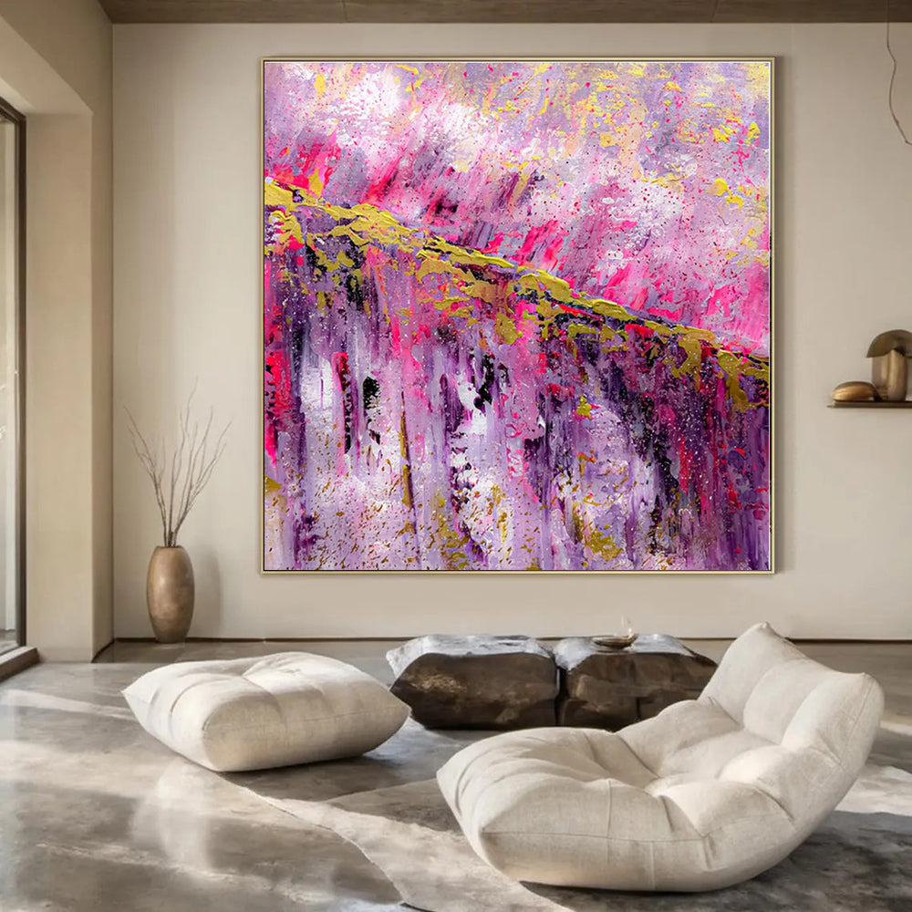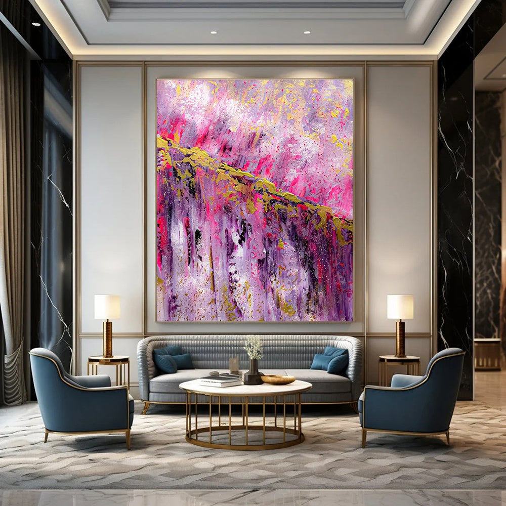 The artist visited a historic garden with a cascading wisteria vine, its purple and pink blossoms dripping like a living curtain. Mesmerized by the way the light filtered through the flowers, turning them into a hazy, dreamy cascade, they knew they had to paint it – but not as a realistic scene, as an emotion. Back in the studio, they mixed swirling purples and pinks, letting the paint drip and flow down the canvas, mimicking the vine’s descent. Gold accents were added to represent the sunlight catching the petals, adding a touch of magic. This painting is a love letter to beauty that feels just out of reach. It’s ideal for a romantic bedroom, where it can set a soft, dreamy mood, or a whimsical boutique, drawing customers in with its fairytale - like allure. The artist worked slowly, building up the layers of color to create depth, then let the paint drip freely, embracing the unpredictability – much like the way the wisteria grows, wild and beautiful. Packaging: Each artwork is professionally rolled and secured in a durable hard-shell tube for safe transit with a 2–3 inch white border around the painting for easy stretching or framing at your local shop. Delivery Timeline: Expect your painting within 7–12 business days including 3–5 days for handcrafting by our artists and 5–7 days for worldwide delivery via UPS or FedEx with a tracking number provided immediately upon shipping.