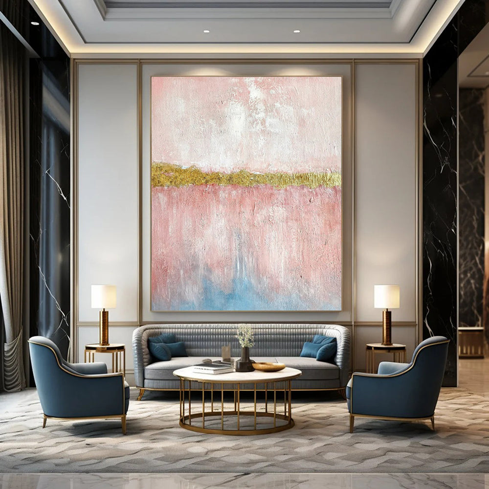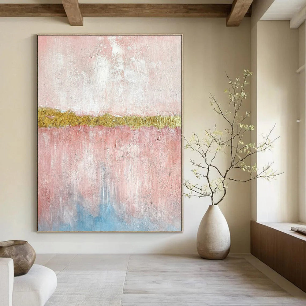 Seeking to blend softness and luxury, the artist painted pink layers and added a bold gold stripe. The gold was applied carefully, giving a touch of glamour. It took days to balance the colors, resulting in a piece that elevates a bathroom’s style or a dressing room’s glamorous feel. Packaging: Each artwork is professionally rolled and secured in a durable hard-shell tube for safe transit with a 2–3 inch white border around the painting for easy stretching or framing at your local shop. Delivery Timeline: Expect your painting within 7–12 business days including 3–5 days for handcrafting by our artists and 5–7 days for worldwide delivery via UPS or FedEx with a tracking number provided immediately upon shipping.